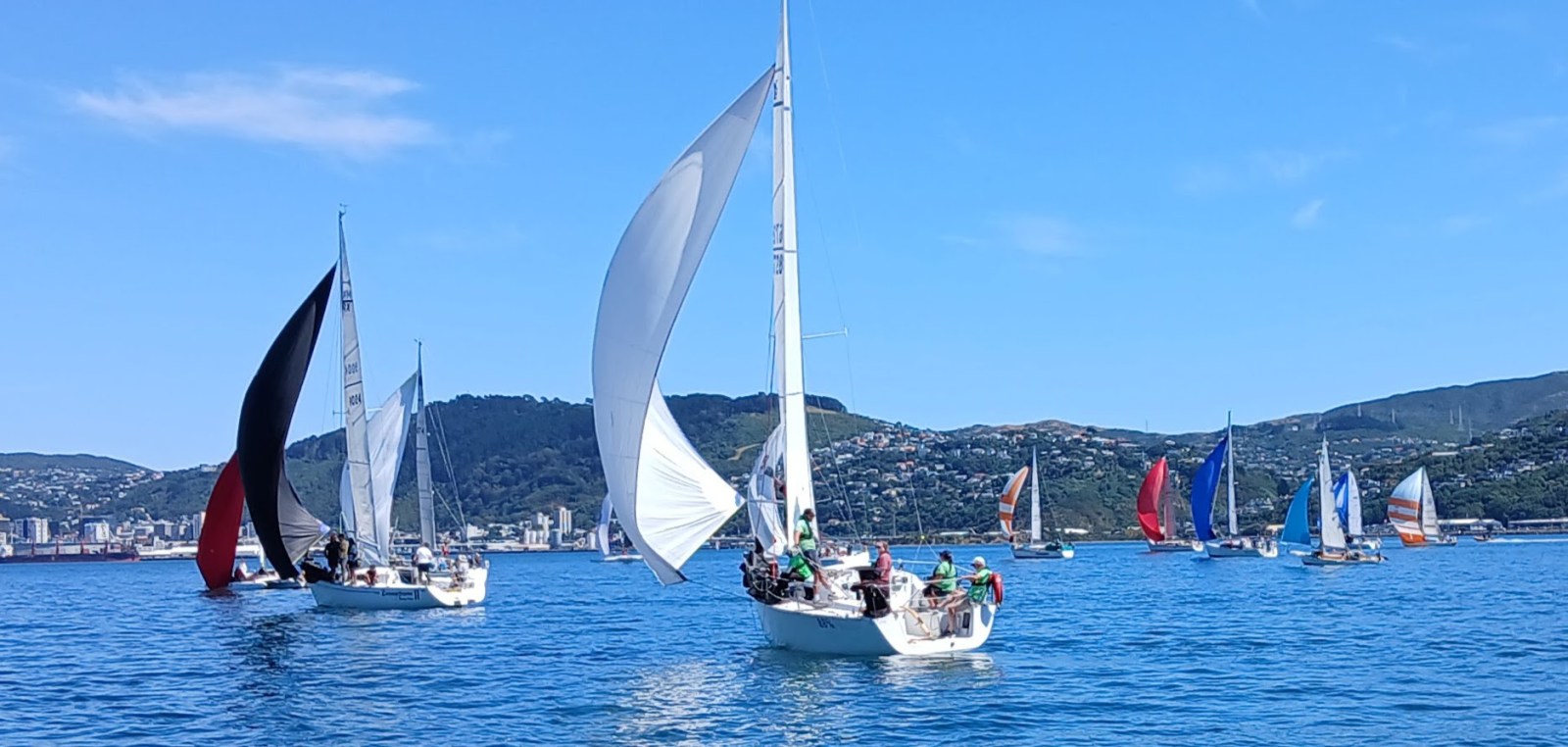 Grenadier and Sliver tacked away to the left but we decided to follow the rest of the fleet directly northwards. After being knocked a bit passing Halswell we got a good lift up towards the west of Somes Island with the wind up to 10 kts. Mel from Latitude 41 South Photography was out getting some good shots of the action.