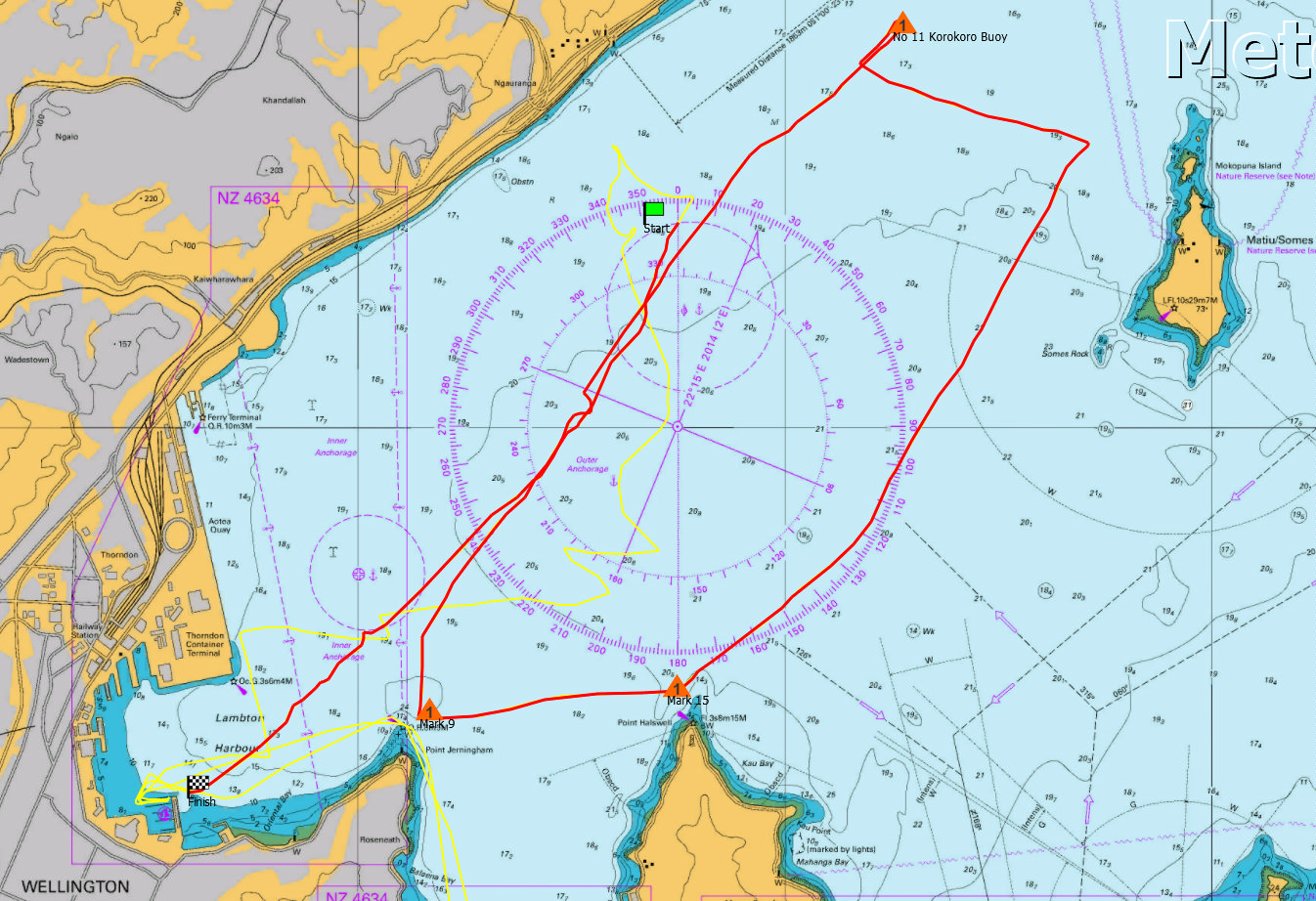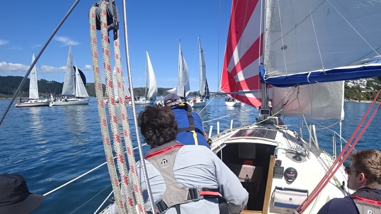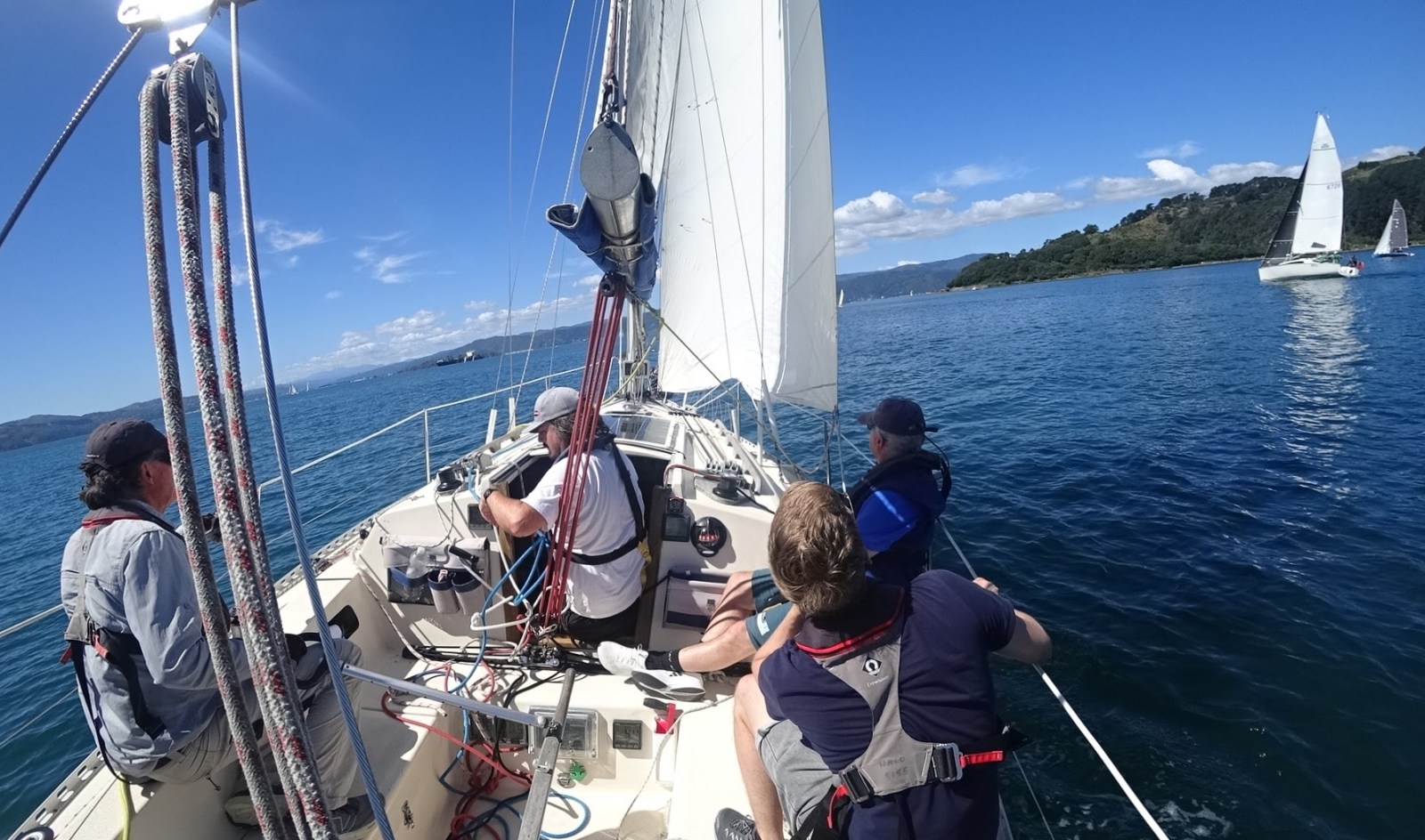 The crew joined me on Halo at midday and we cast off early from Chaffers so we’d have plenty of time to get up to the Ngauranga start area. We hoisted the heavy #1 genoa with full main and did some practice sailing in a nice breeze of 10 kts. Crew positions were John on bow, Paul on mainsheet and keys, Max and Jamie on headsail trim with me on helm.