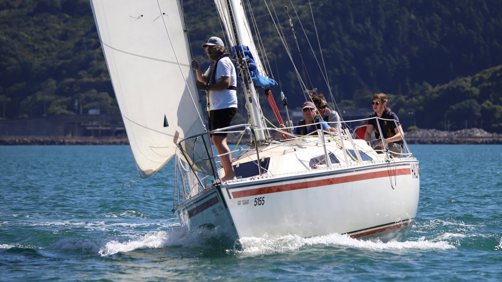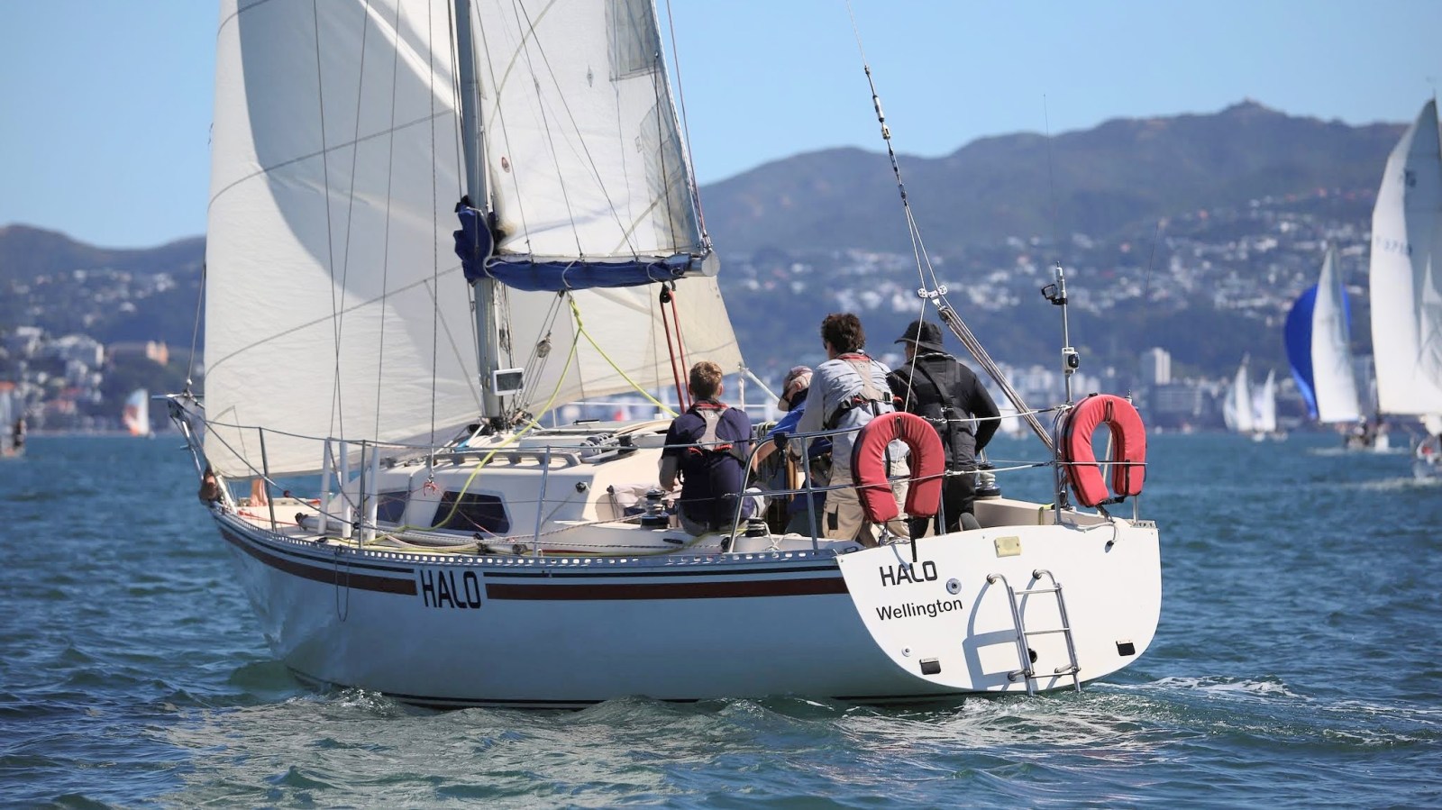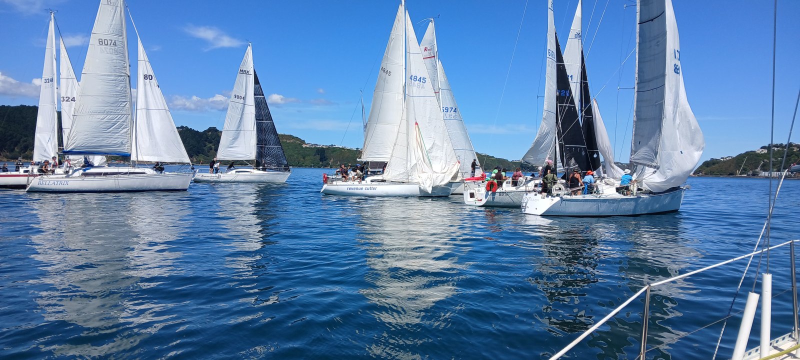 The crew joined me on Halo at midday and we cast off early from Chaffers so we’d have plenty of time to get up to the Ngauranga start area. We hoisted the heavy #1 genoa with full main and did some practice sailing in a nice breeze of 10 kts. Crew positions were John on bow, Paul on mainsheet and keys, Max and Jamie on headsail trim with me on helm.