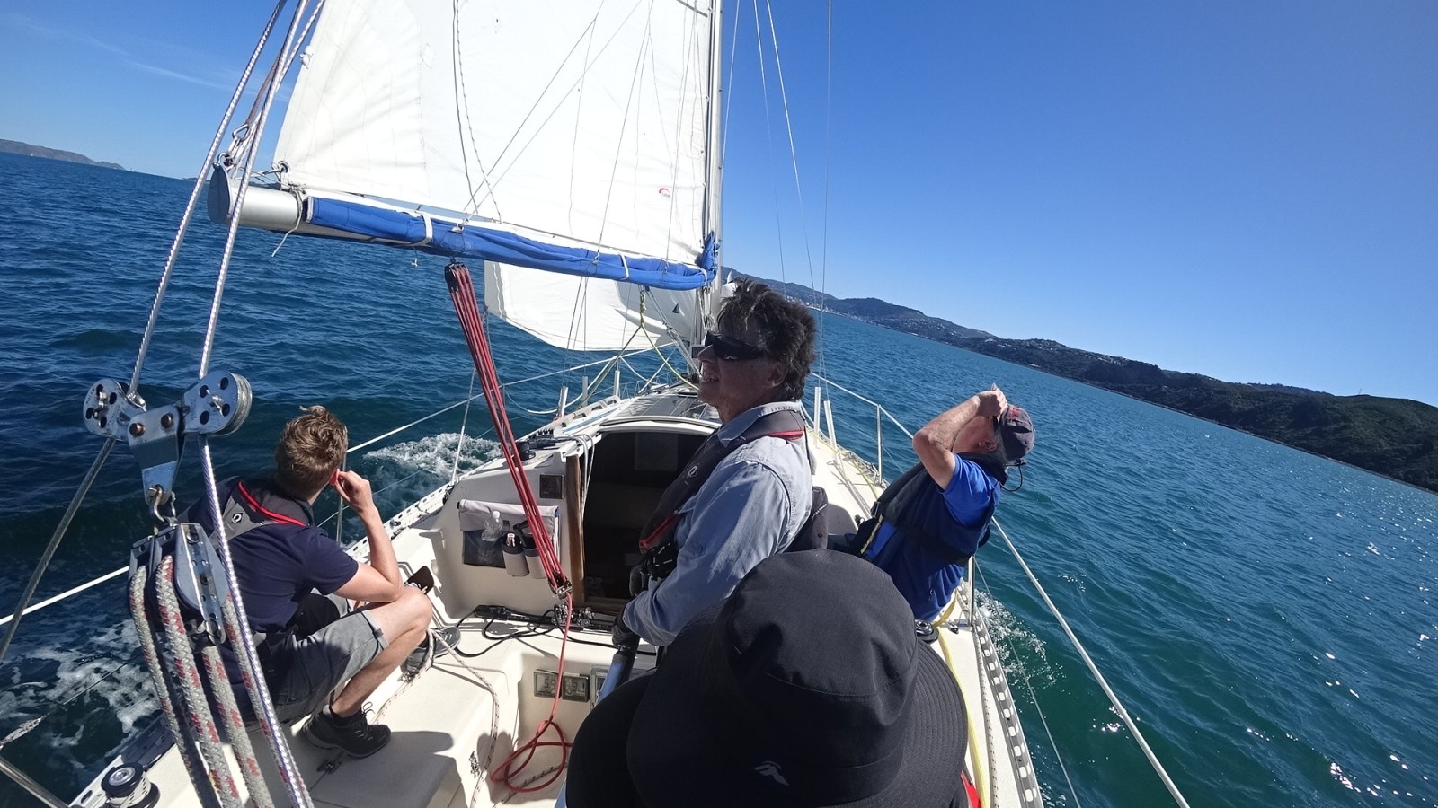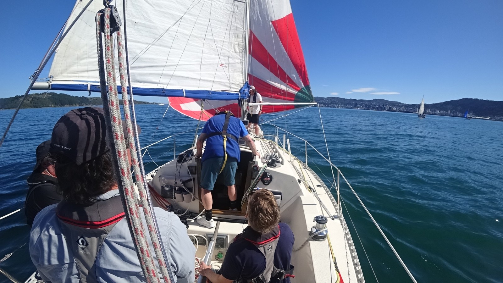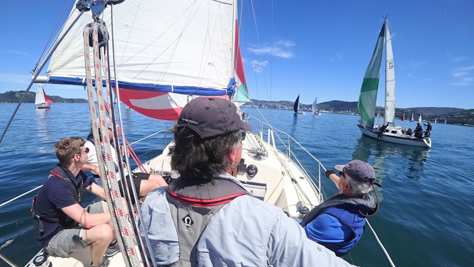 Once we rounded Mark 15 near Pt Halswell we tensioned up the sheets to sail close-hauled back up the harbour. Nice to cool off with a bit more breeze in our faces.