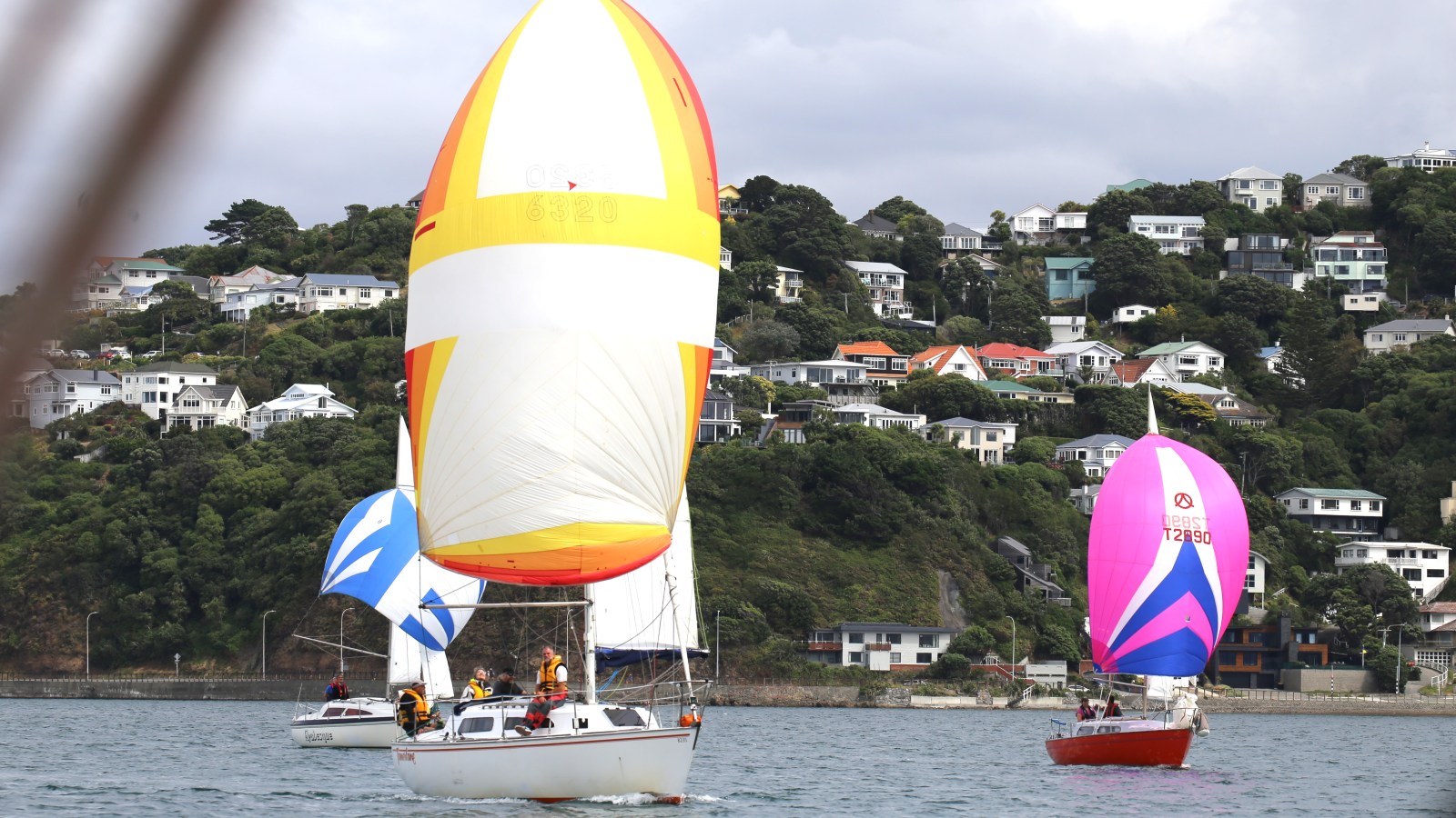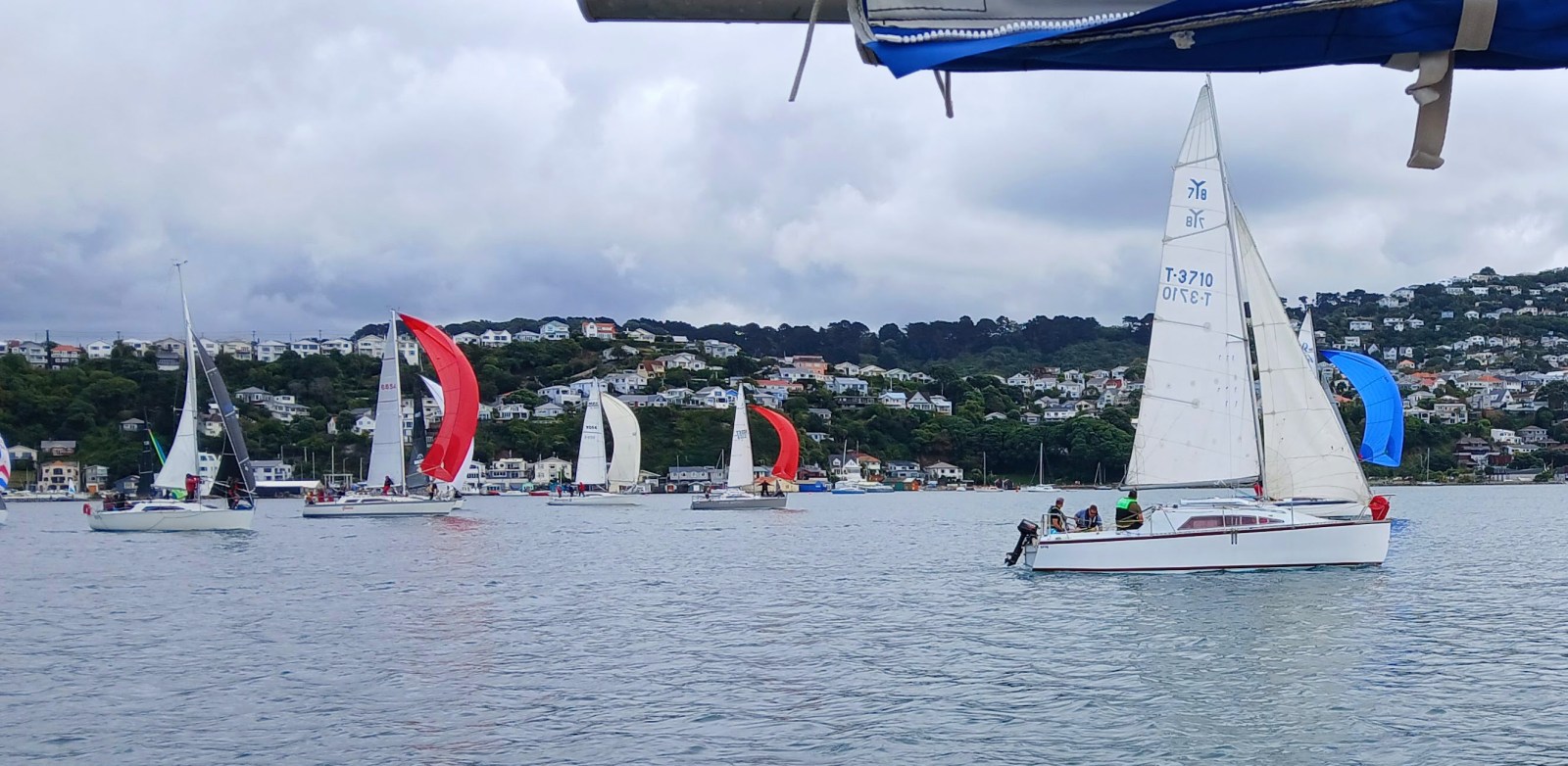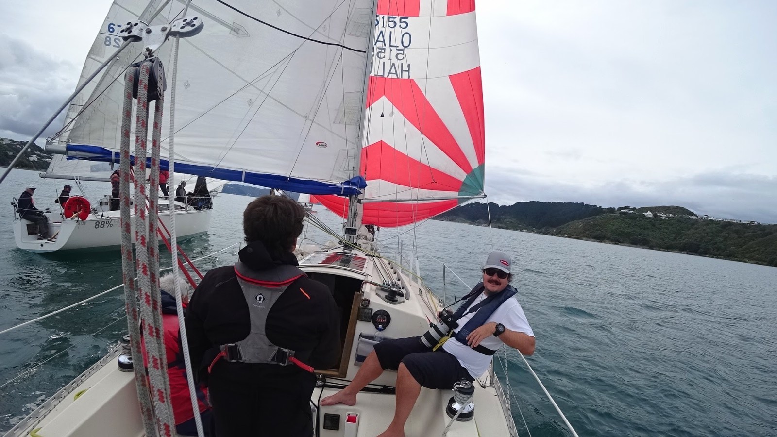 We were soon enjoying 15 kts of wind for the beat up Evans Bay. The wind was at the top end of the range for our genoa but it was pulling well with Jamie and Eduardo maintaining good trim. Murray was keeping an eye on Grenadier behind us and we covered them as they tacked.