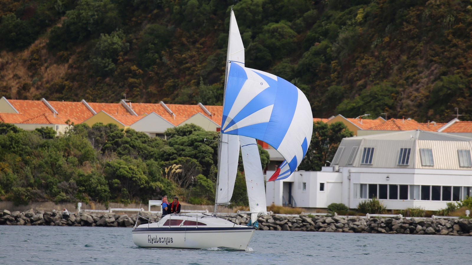Hoping for the best, we rigged up the #1 heavy genoa. We sailed round to Evans Bay tying up at the poles next to the slipway. A very light easterly. Go figure!