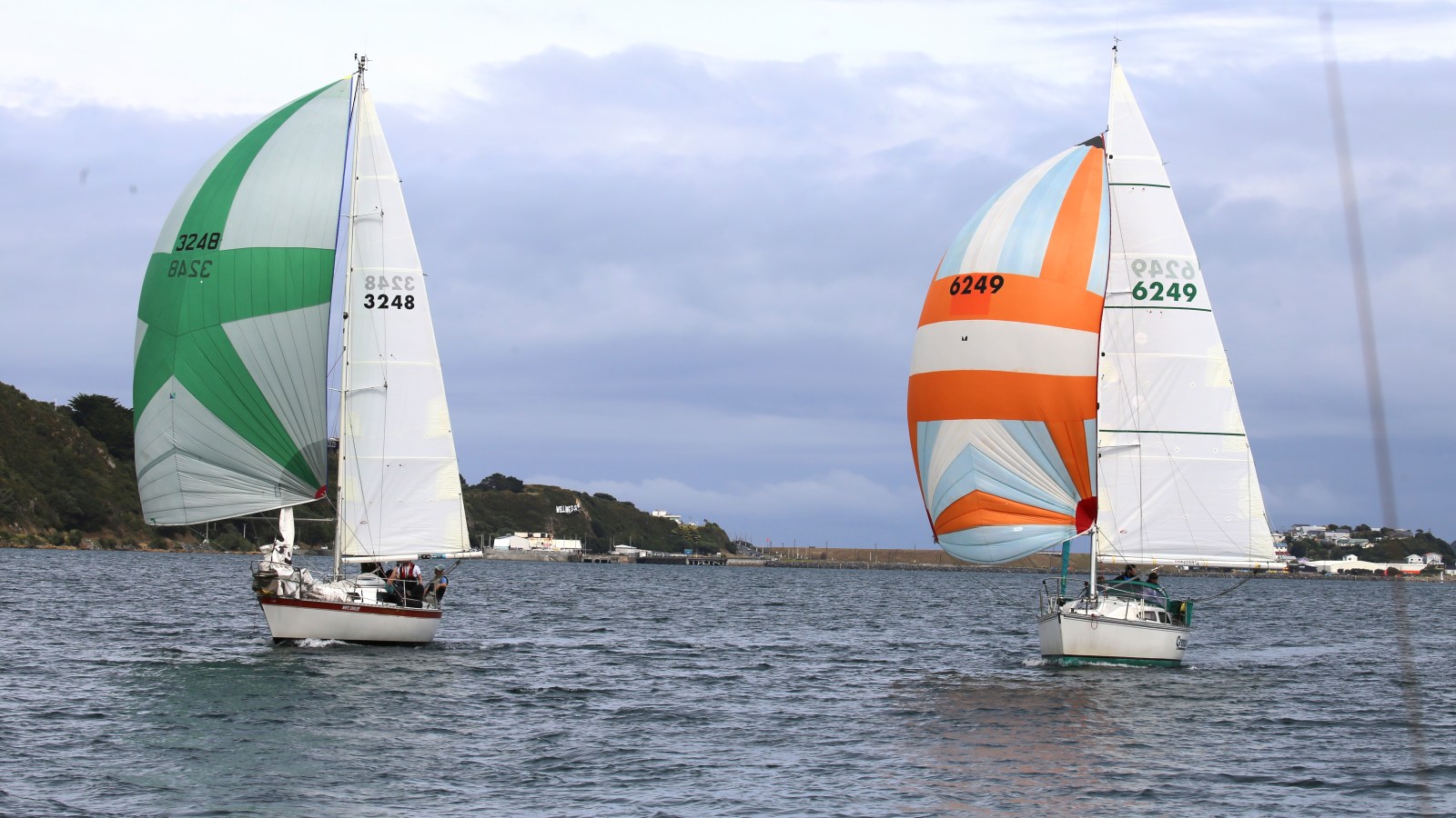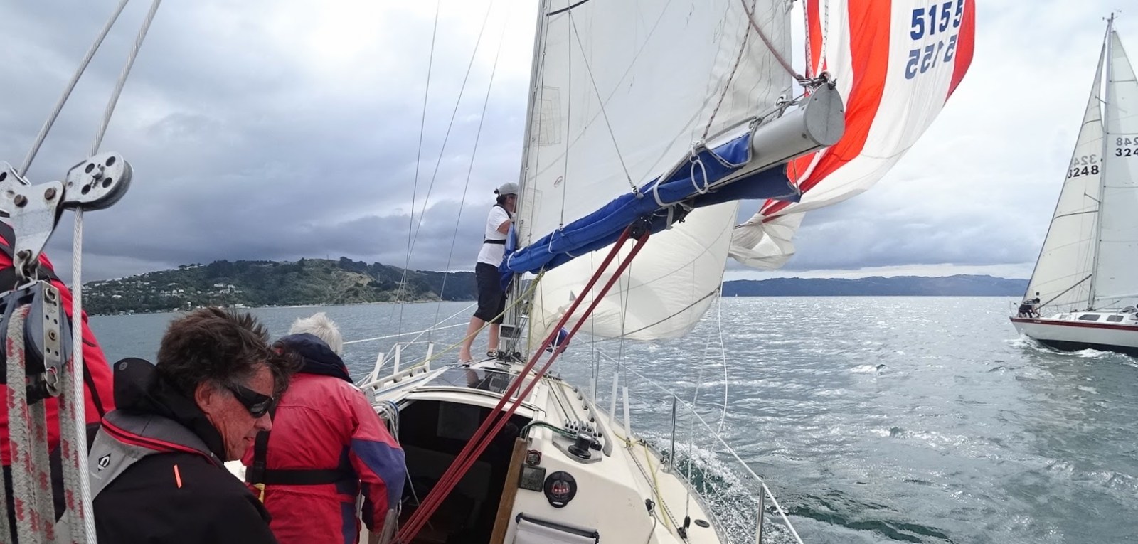 After gybing around Falcon Shoal at 1405 hrs we were now on a beam reach back to Pt Halswell. After waiting to check the wind angle we decided to hoist our medium spinnaker. It didn’t set properly the first time so we dropped it and tried again. Good work John.