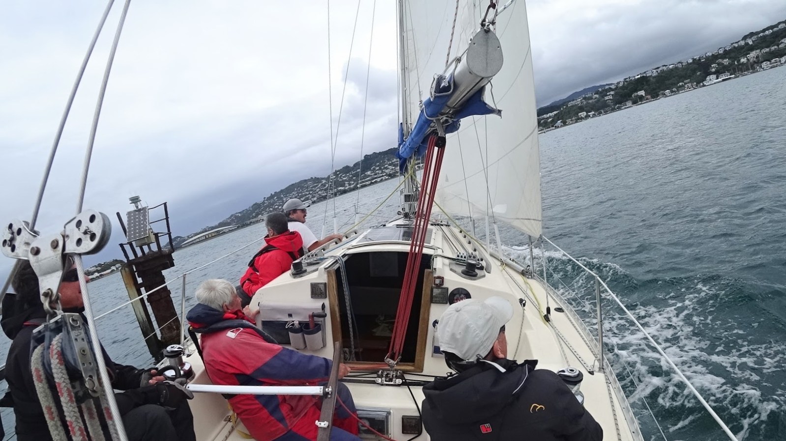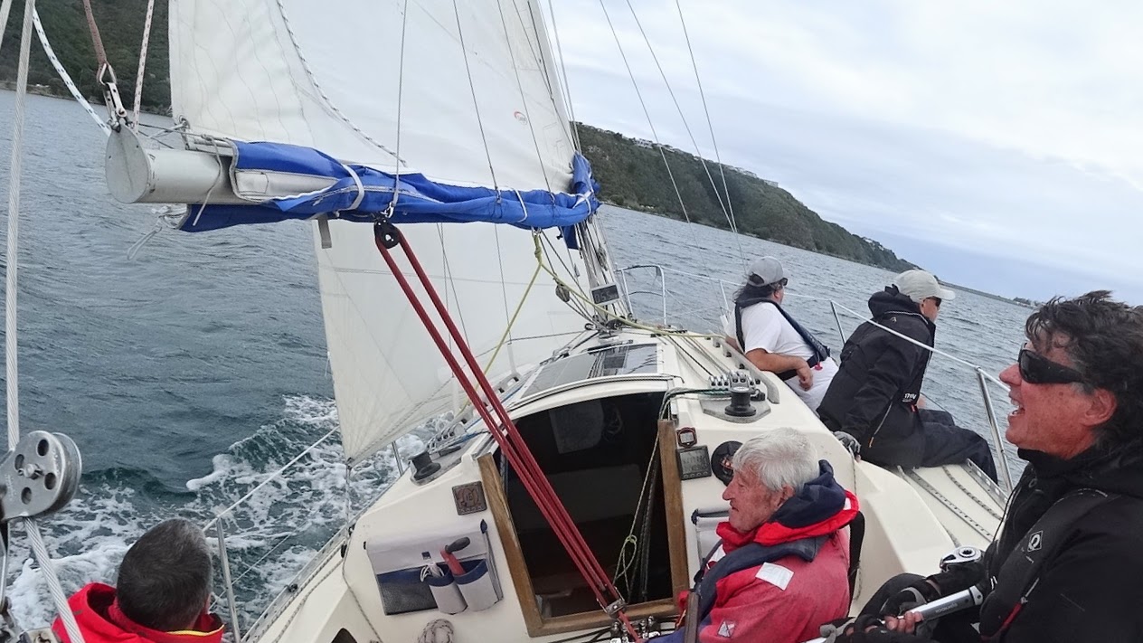 On the way back to Chaffers we had a slight incident. The Ronstan winch handle got pulled out of its holder and popped overboard into the water. We looked back and there it was – floating! We circled back and picked it up with the fish net. Good MOB practice.