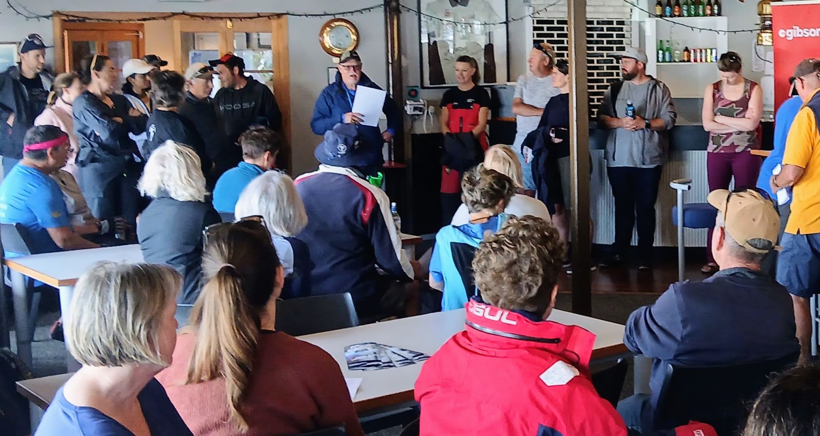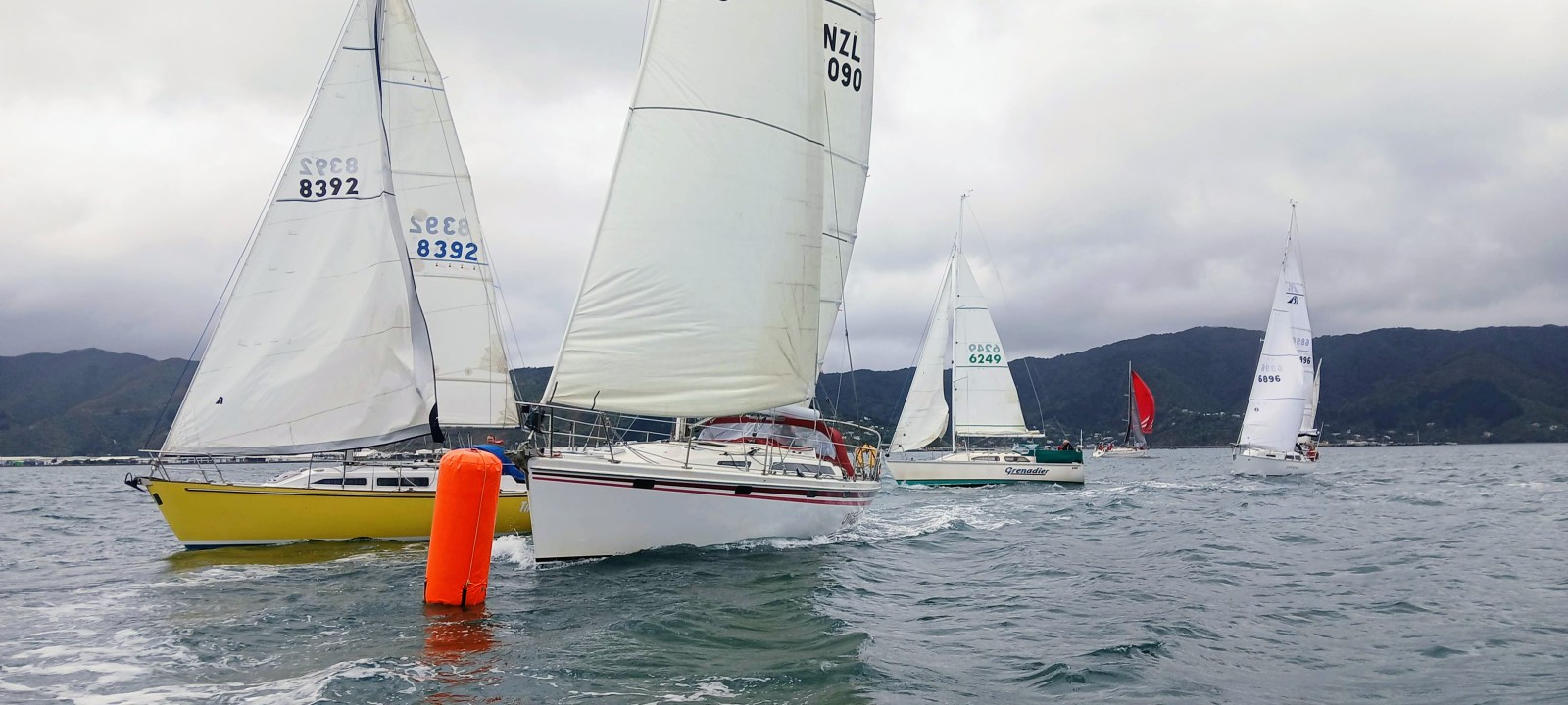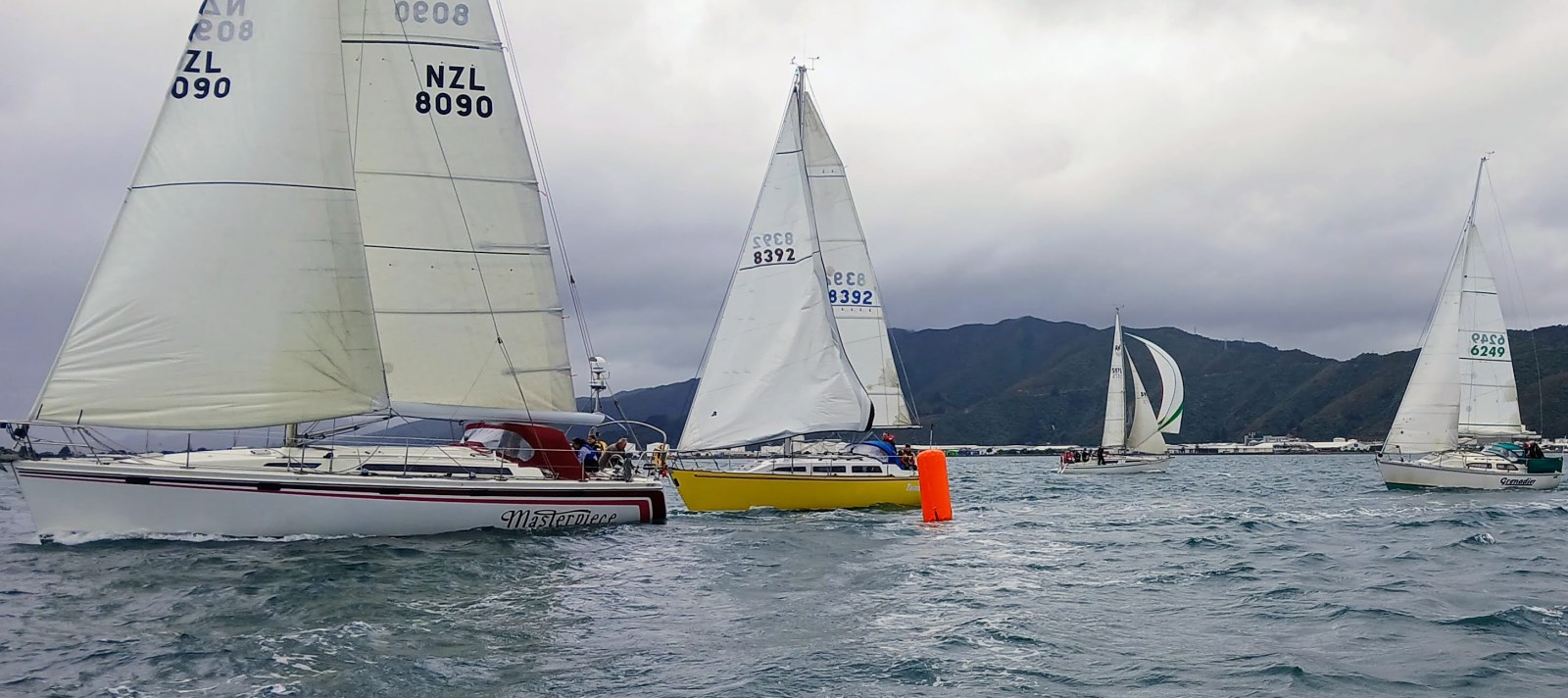 In view of the windy conditions we requested to move Halo into the Non-Spinnaker Division. Grenadier followed suit. After coffees at Compass Cafe we attended the race briefing in the clubhouse. Race Officer Ray Manning gave us all the details and announced the harbour course for Race 1: Start – 19p Petone Wharf – 20p Northern Somes buoy – 18p Days Bay – Finish. Start time 1100 hrs. The Y Flag was flying meaning all competitors must wear personal flotation devices. Ray also recommended that boats should reef their mainsails.