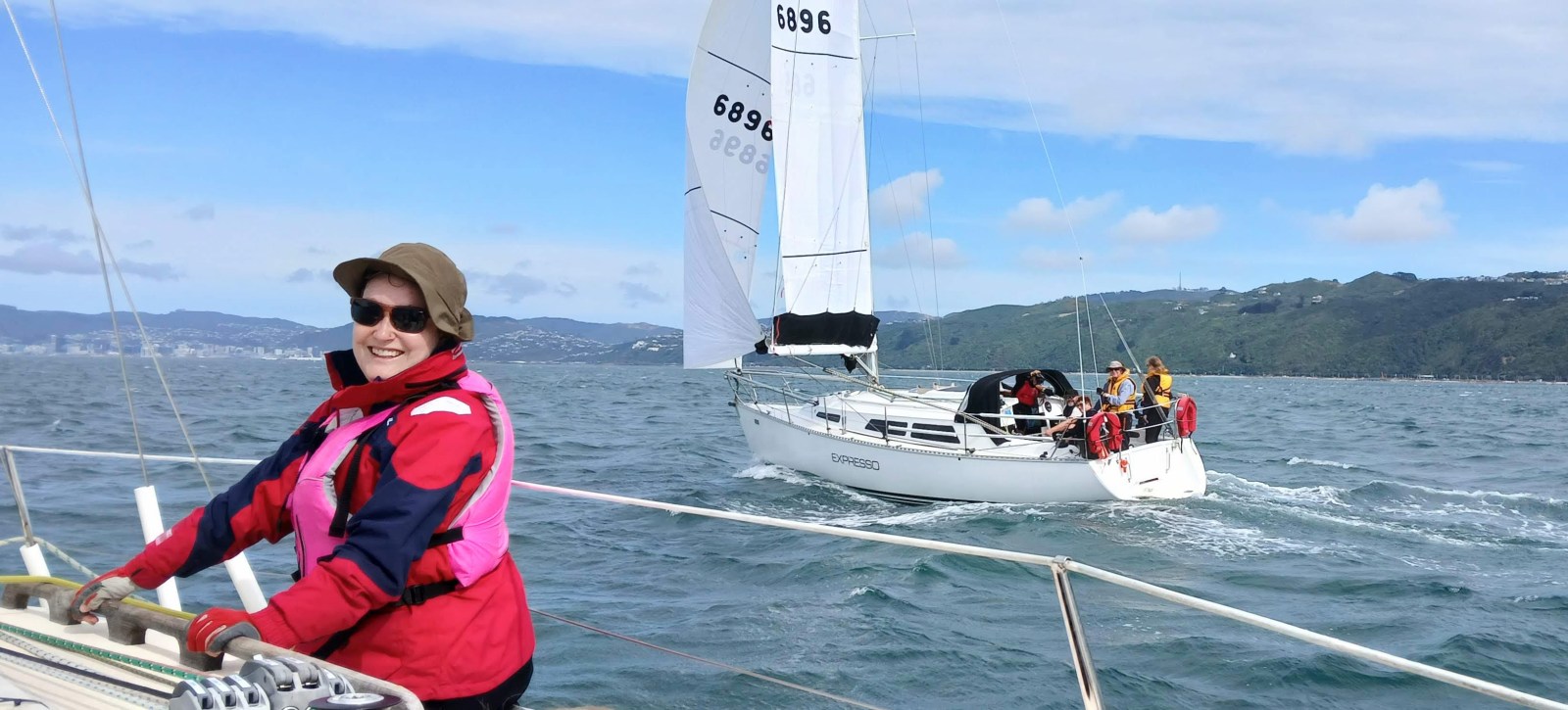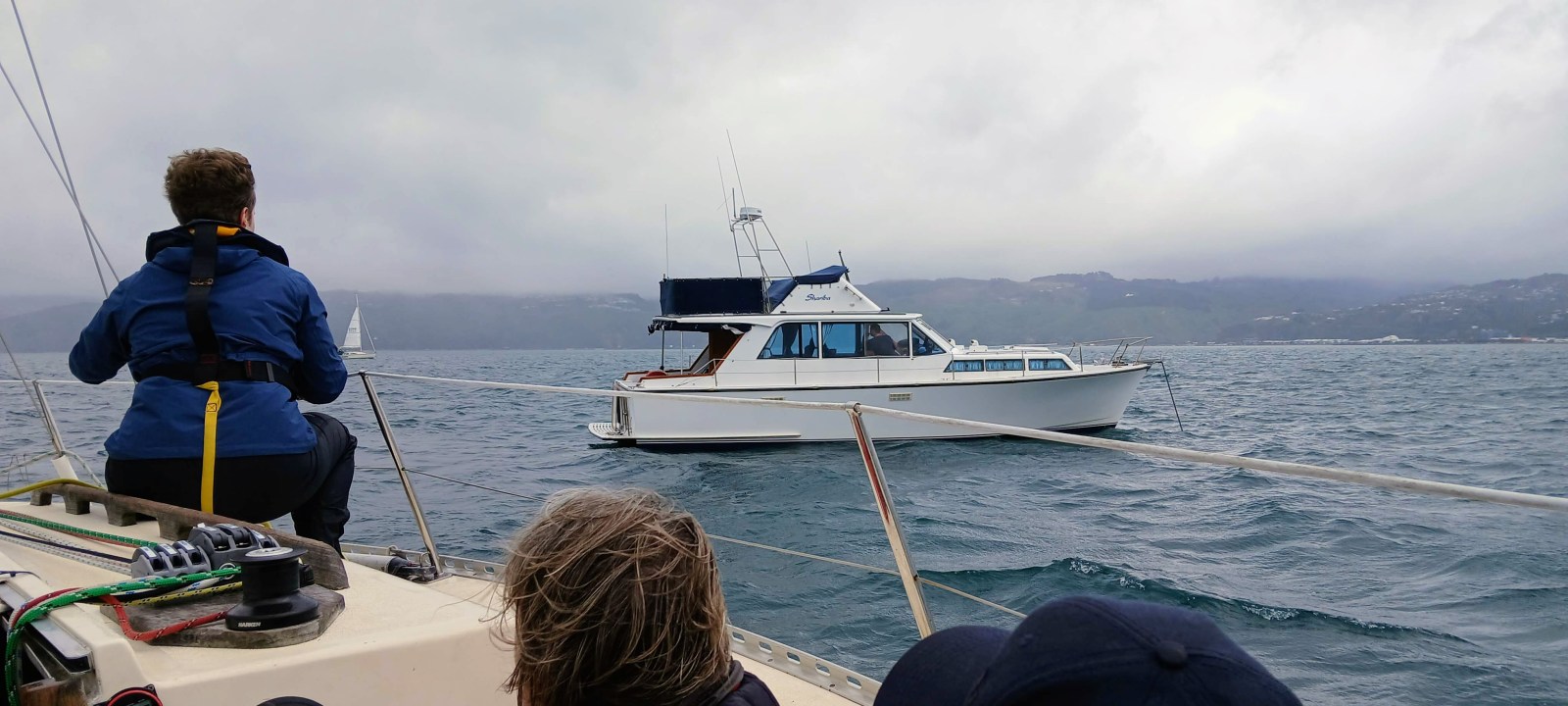 We rounded the Days Bay mark and headed back to the finish line. Halo was now bouncing around quite a bit as we sailed close-hauled into the waves. At one stage Marion lost her footing and we did an inadvertent tack. We soon recovered and Marion was back on the tiller. No damage done.