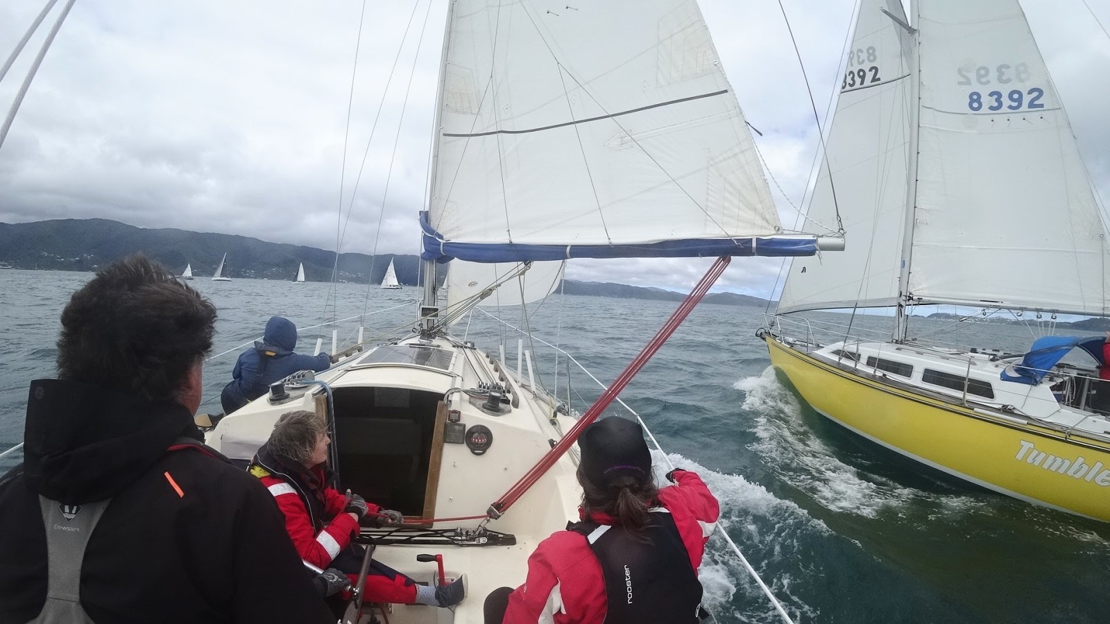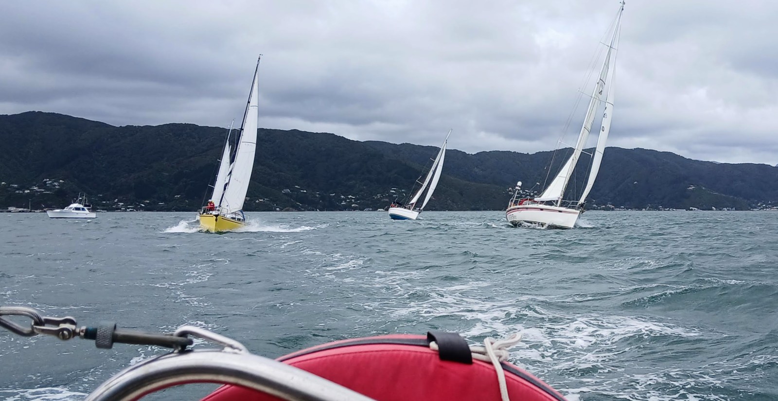 At 1100 hrs the race started. We crossed the line at the boat end. Not the first but we were in clear air as we headed close-hauled up to the Petone Wharf mark.