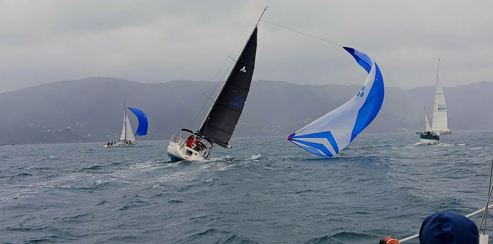 Oh wow, what’s this? Am Meer are in trouble with their big blue spinnaker. It was flapping all over the place and then totally ripped in half as they were dropping it. Katie and Geoff won’t be happy.