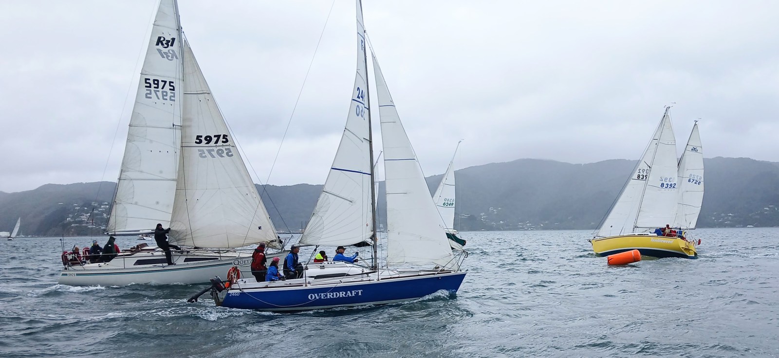 Another breezy day. There were to be up to four round-the-buoys races today with the first race starting at 1030 hrs. Powered up with the great coffees from Compass Cafe we cast off from the berth at 0950 hrs. With the NE averaging 12-16 kts decided to rig the #2 jib rather than the smaller #3 we used yesterday. It started raining.