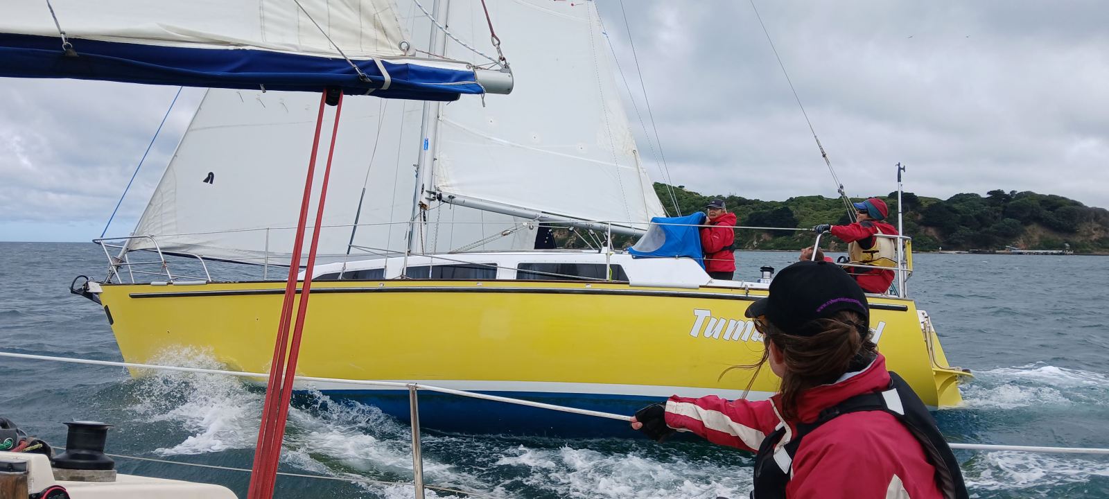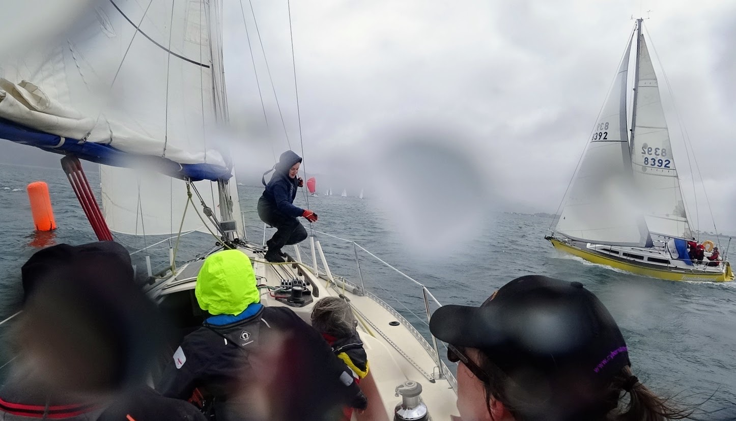 A bit of excitement on the first leg as Halo and Grenadier were close together on starboard tack. We were preparing our turn when a gust came and suddenly Grenadier tacked right in front of us. We were on a collision course to T-bone them! Marion’s super quick reactions on the helm saved the day (and the boats) by tacking away and we were able to avoid a collision. We learned afterwards that Andrea on helm had lost her footing and slipped down in the cockpit. We called ‘protest’ and they did the required 2 turns.