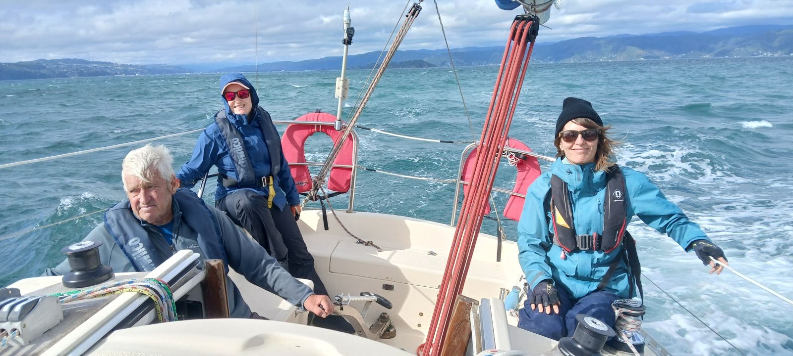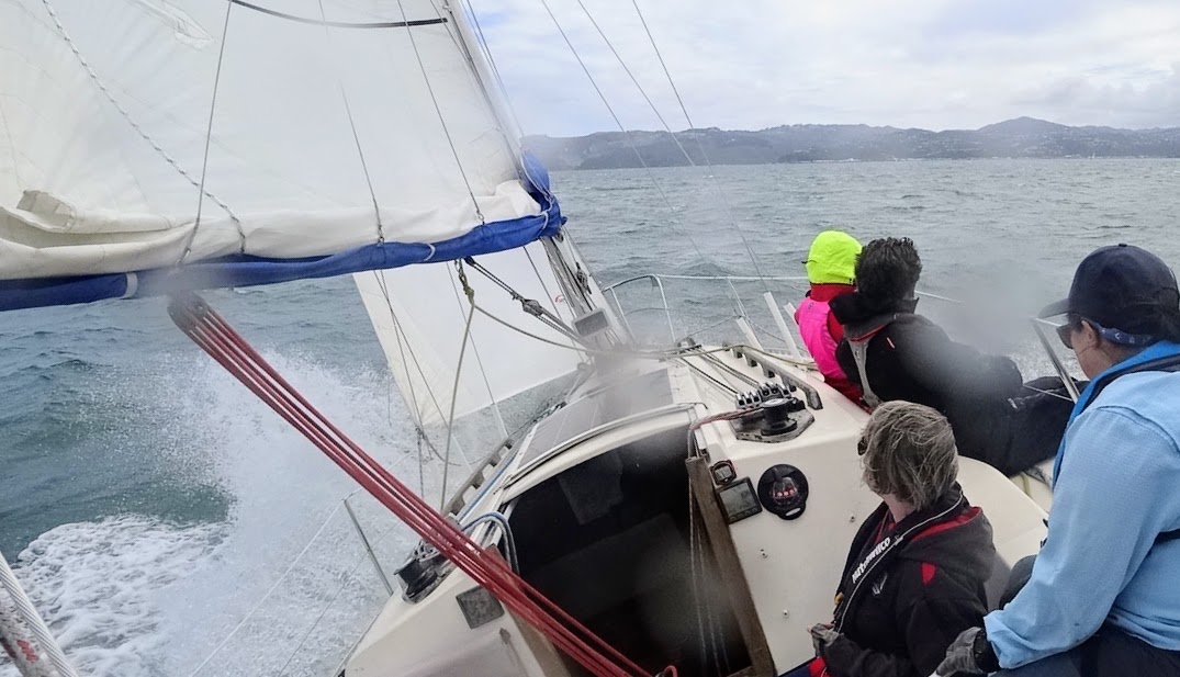 Murray joined us to help with the delivery trip back to Wellington along with Meredith and Funny. The wind had come up very strong by now with gusts over 35 kts. I did a trip report with Maritime Radio to be on the safe side and we sailed fast across the harbour with just the headsail flying.