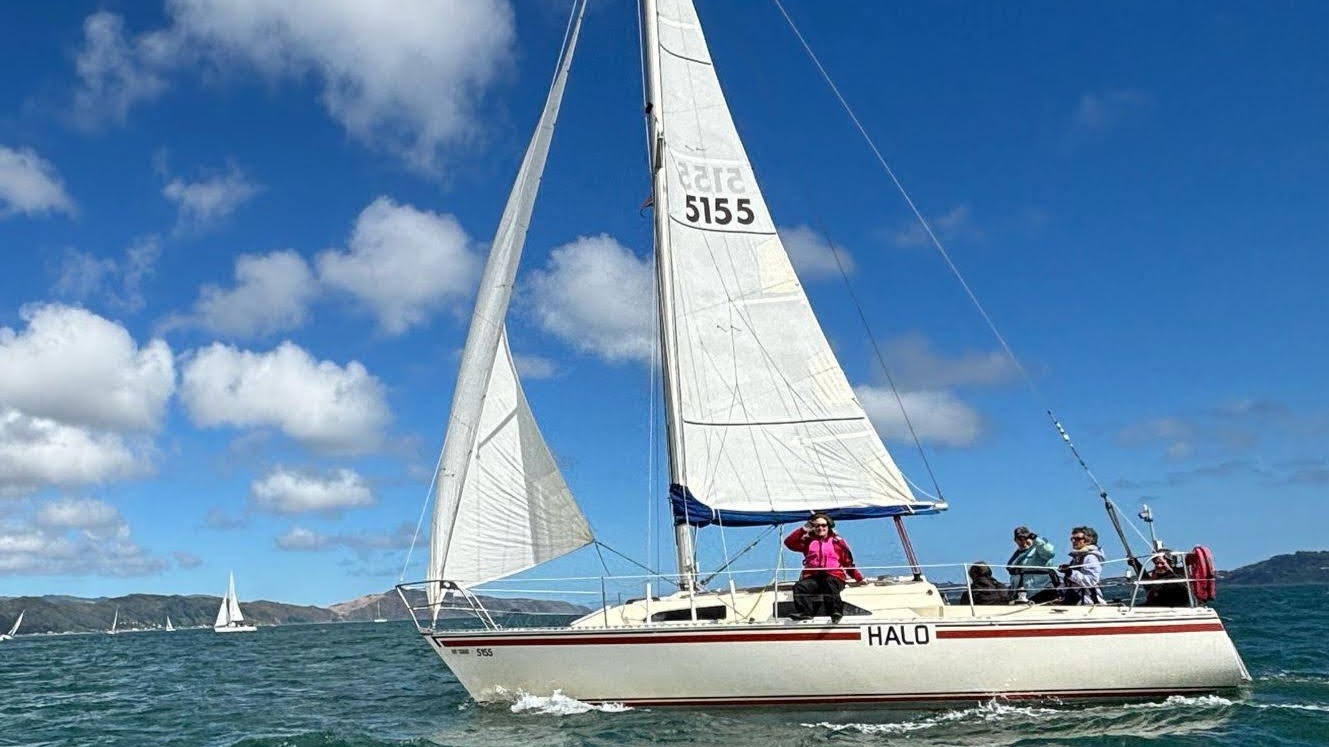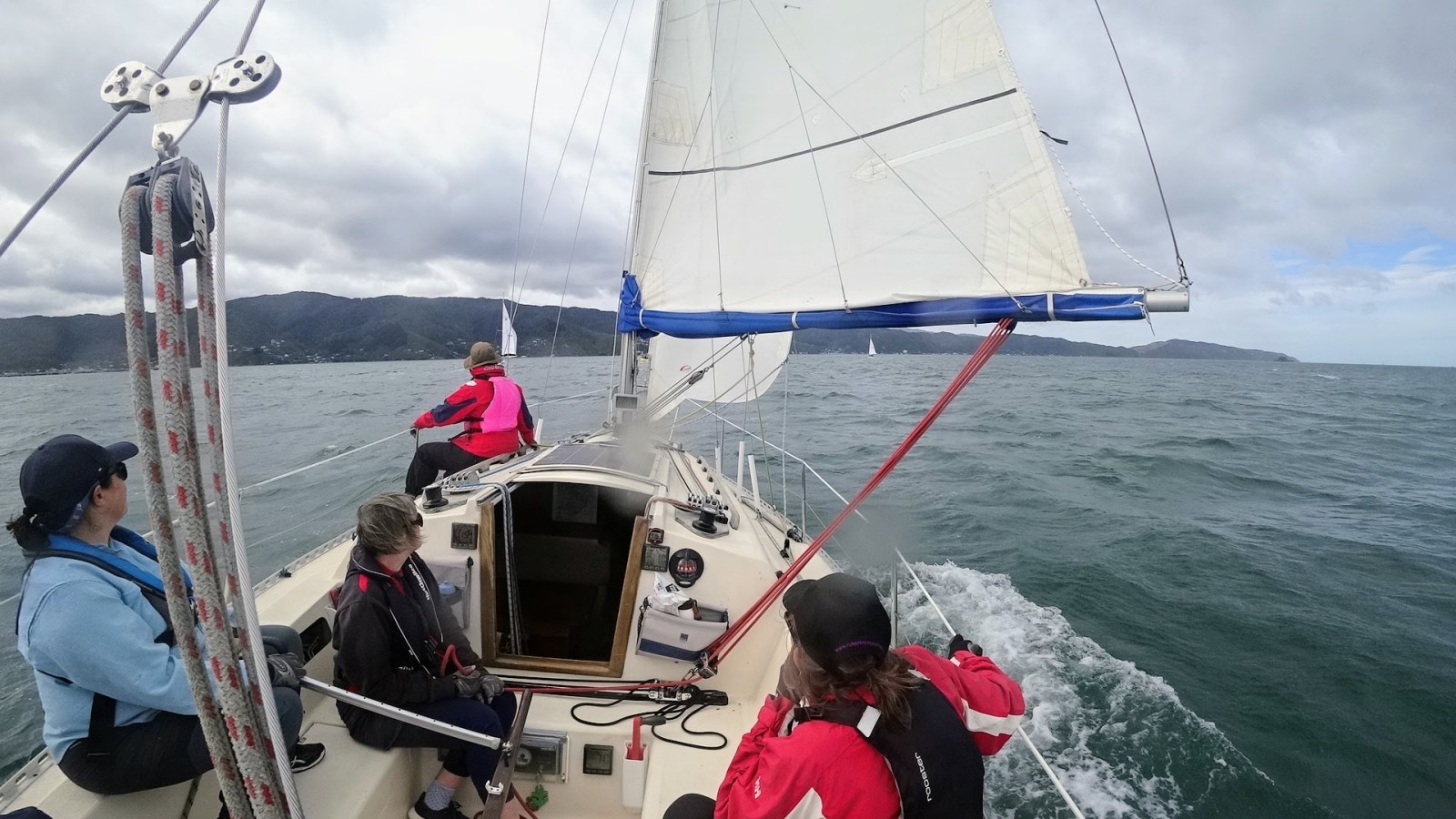 Crew: Marion (helm), Funny and Katherine (sail trim), Jane (mainsheet), Meredith (bow), and Geoff.