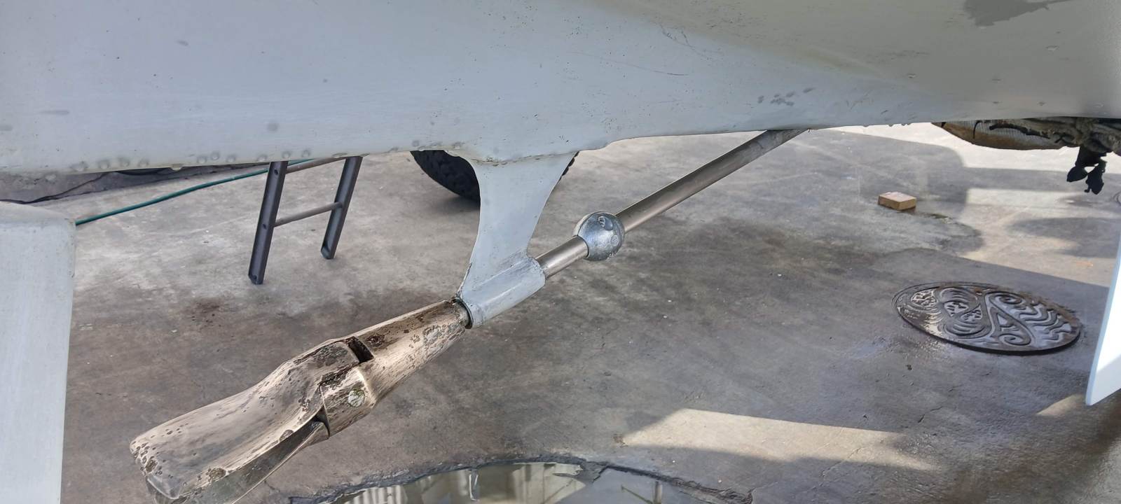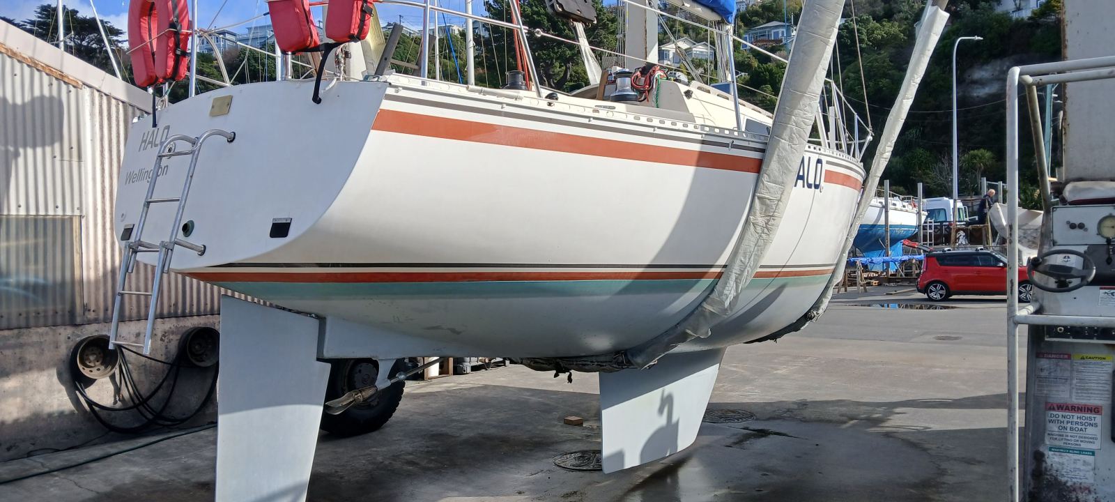 21 May 2025 – I motored Halo round to the Evans Bay slipway. I contracted Victor Crooks to straighten and re-weld parts of the pulpit and the bent stanchion.