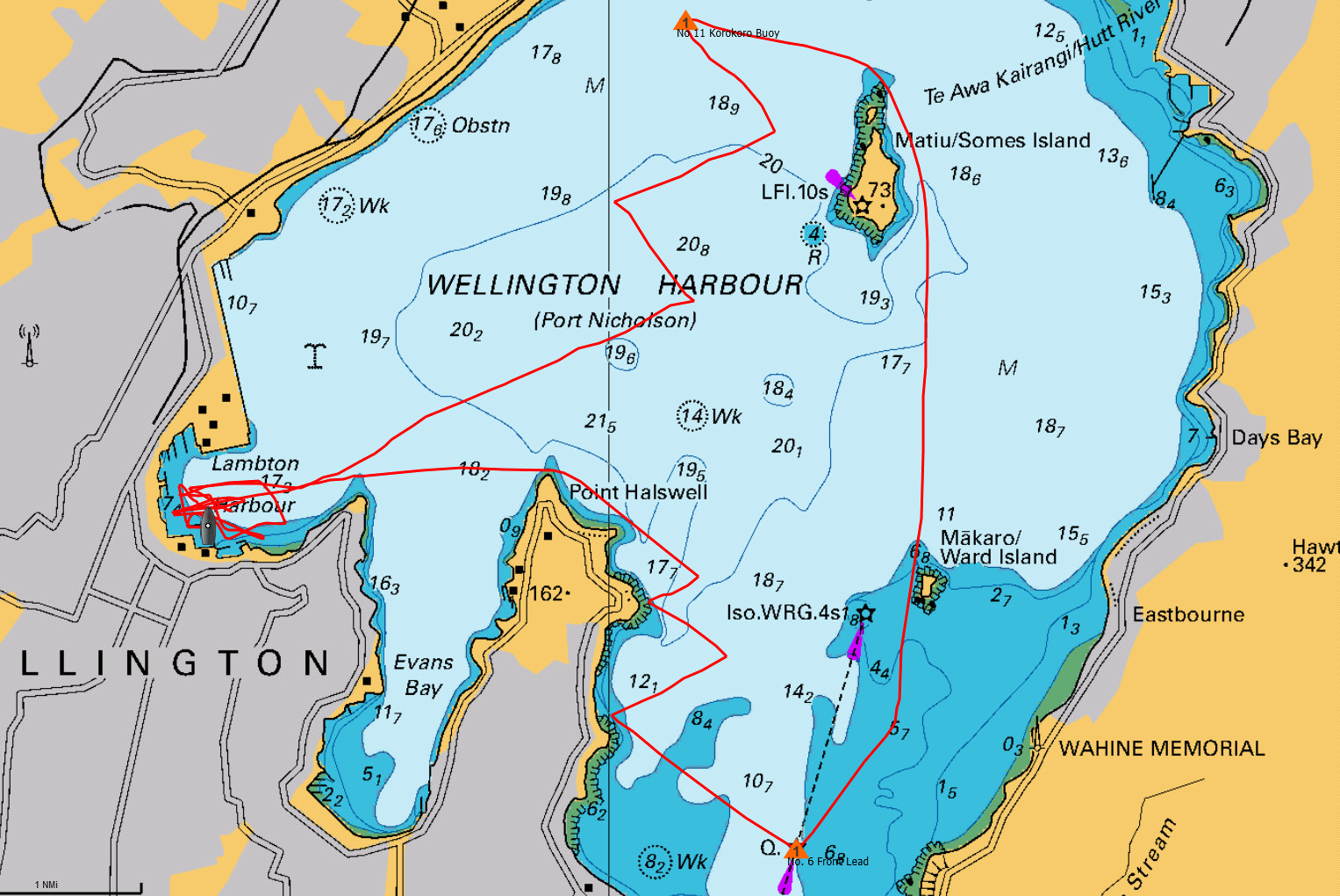 We hoisted the small #3 headsail and one reef in the mainsail and called up Race Control on VHF Ch. 62 to sign on with 4 POB. The course was announced. Start – 16 (p) – 11 Korokoro (s) – Somes (s) – 6 (s) – Finish. Starting at 1200 hrs.