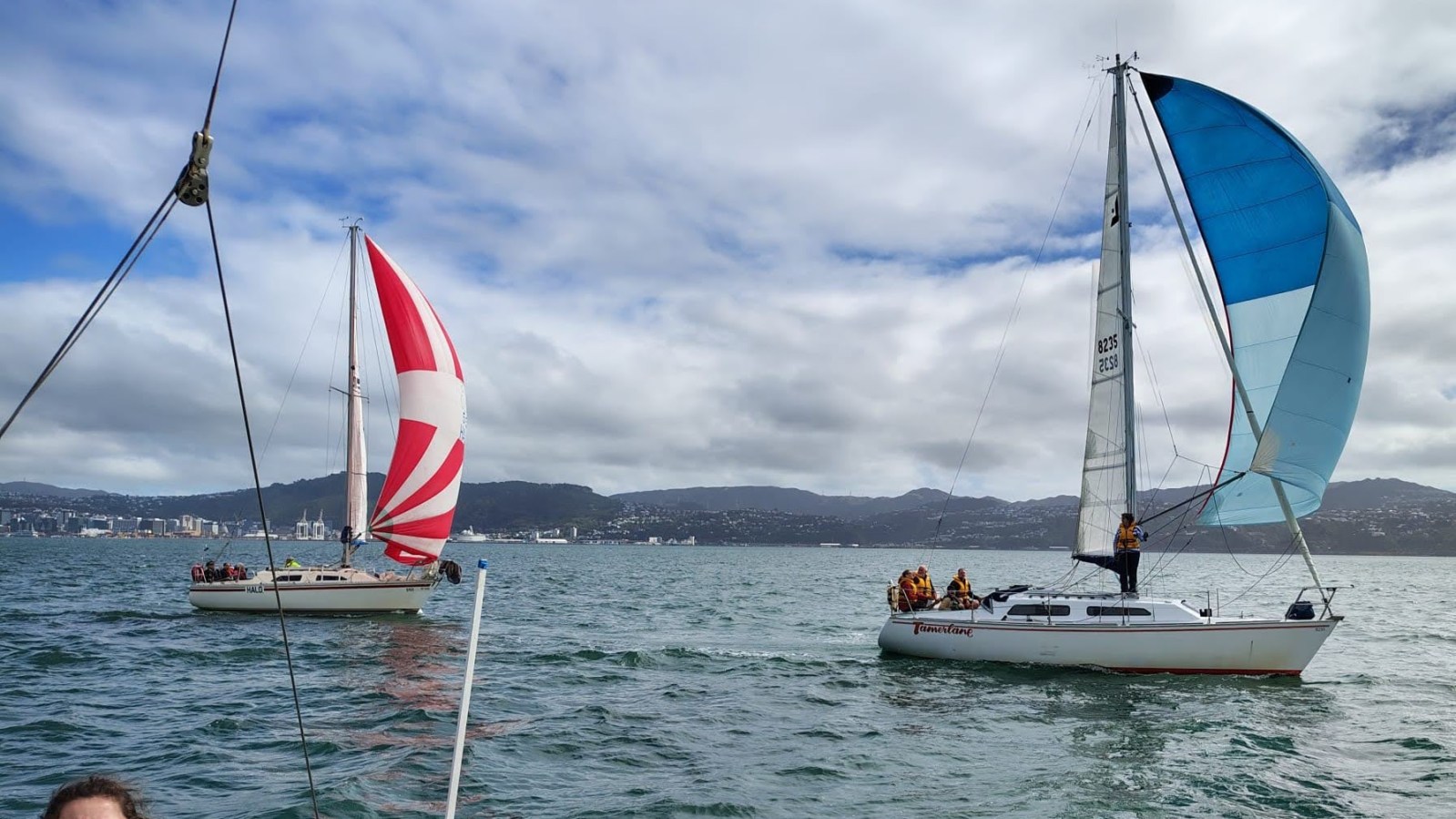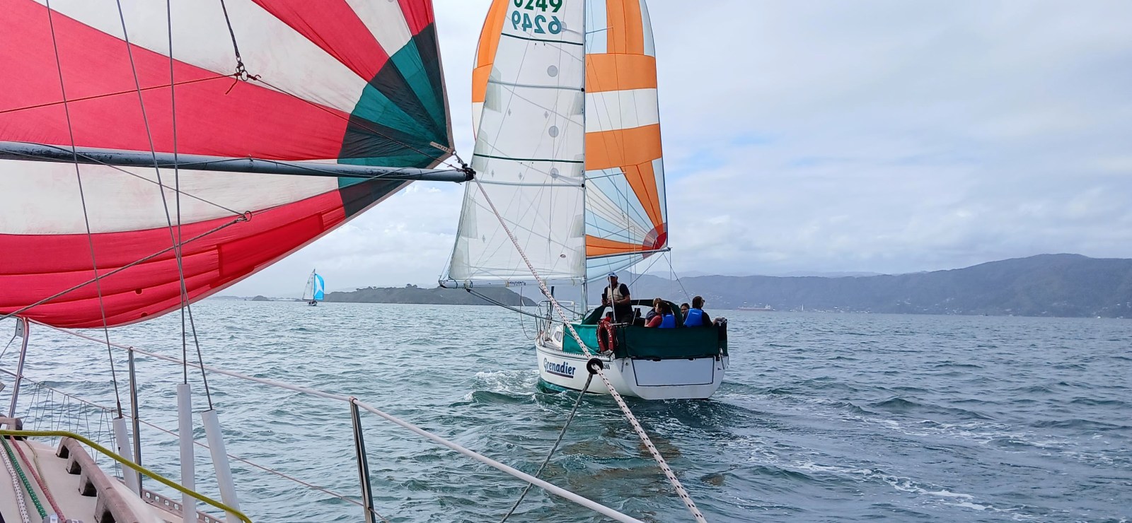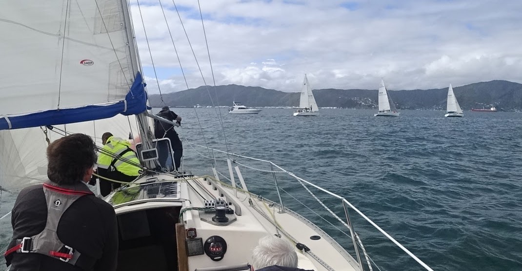 We quickly hoisted our maxi spinnaker and crossed the line, behind Grenadier and Tamerlane but ahead of Slingshot. The SW wind was directly from behind, at roughly 180 degrees, so we were running before the wind on a “dead run” all the way out of Evans Bay.
