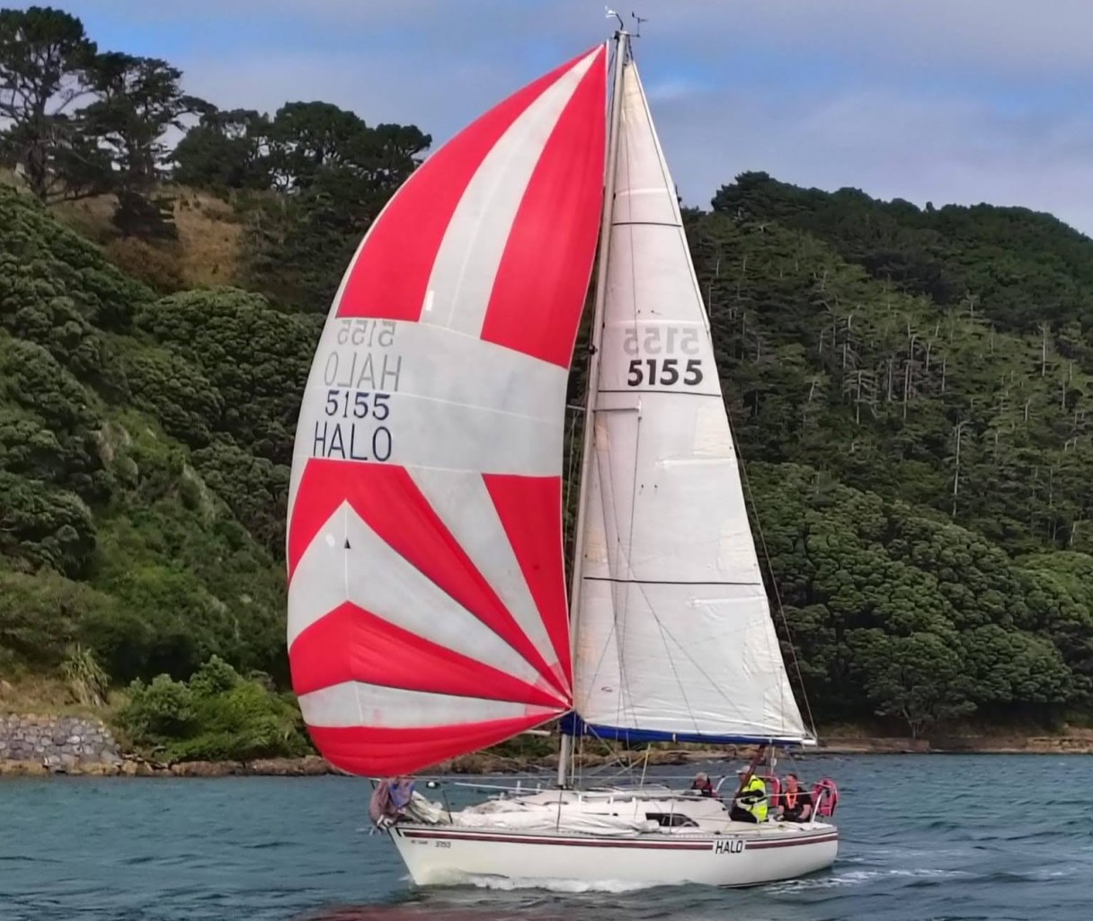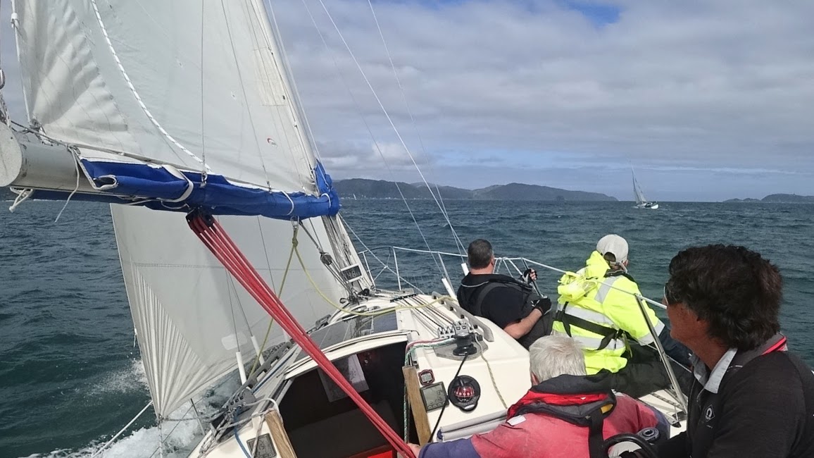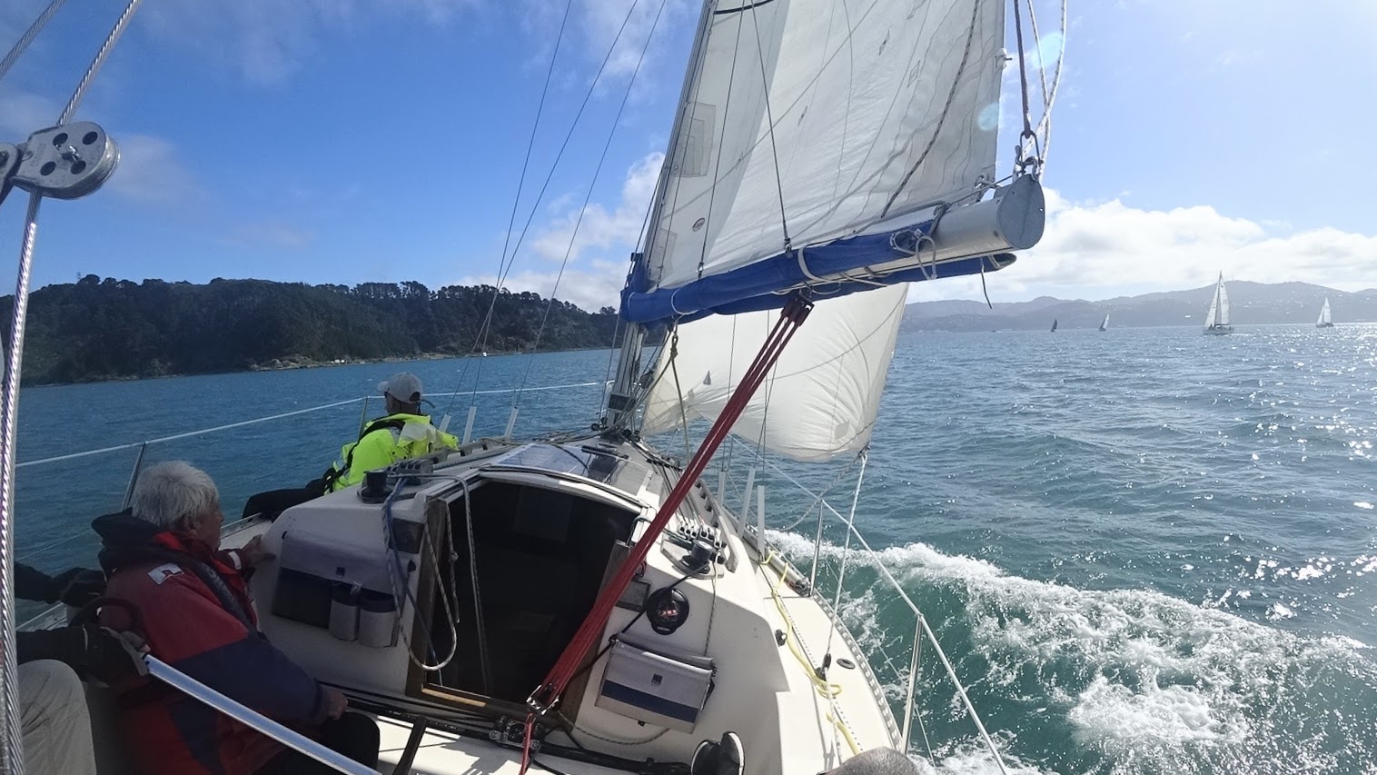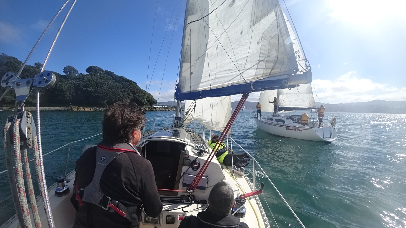 The tactic sort of worked and we were able to keep up good speed across Kau Bay but as we neared Pt Halswell we got caught in a short wind shadow. Tamerlane, ahead of us, were now pretty much stalled as we slowly sailed past them!