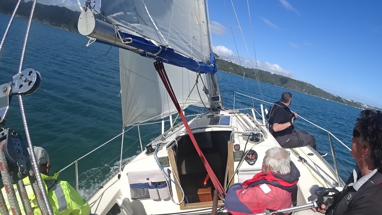 Jamie and Eduardo hoisted the genoa and stowed our spinnaker before we rounded the rocks north of Mokupuna Island. We then tensioned the sails to sail close hauled towards Ward Island in about 15 kts of wind.