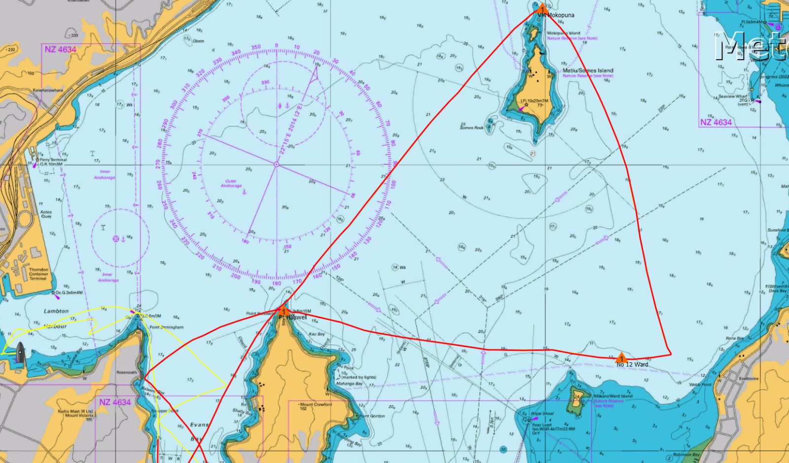 Usurper, the leading boat, called over the VHF that the mark was missing. The consensus was that we should replace Mark #5 with rounding Matiu / Somes Island.