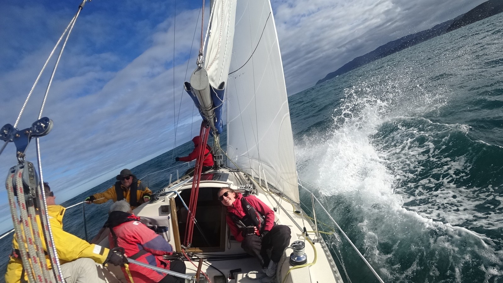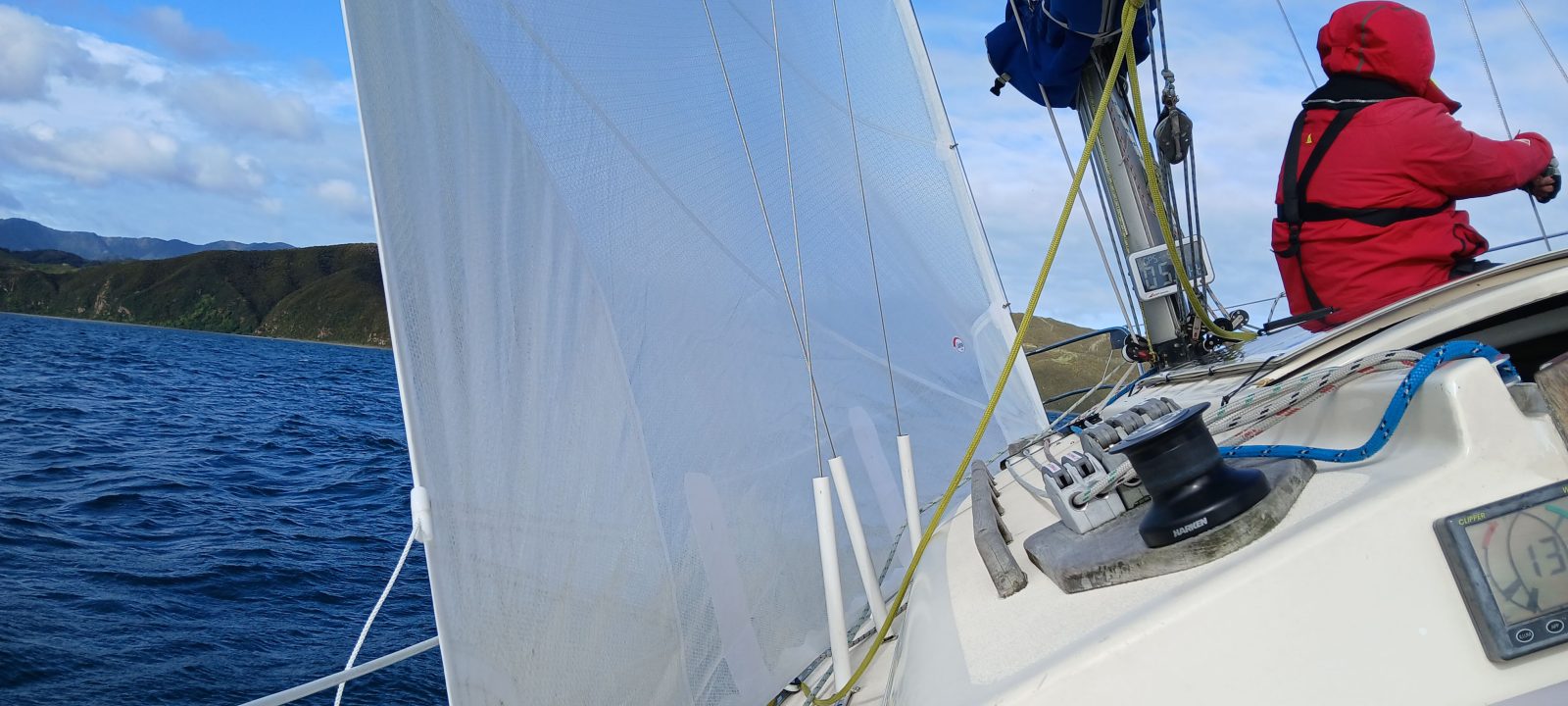 It was looking like a perfect day to try out the brand new headsail. Our old no. 1 heavy genoa was 40 years old and falling apart. Brett from Linton Sails made us a lovely new sail made of FLEX Polyester Mylar cloth.