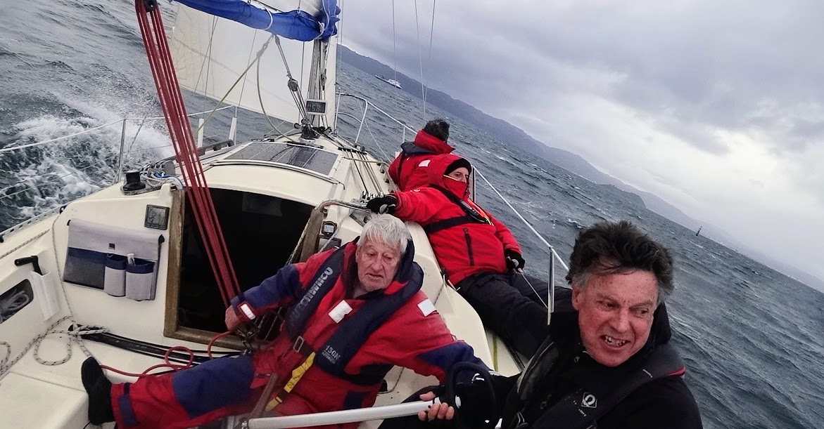 The fleet soon spread out with Halo about in the middle. Currahee, a Lotus 9.5, was pointing well, with more sail up than us, and crossed ahead of us.