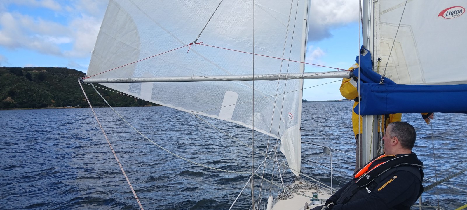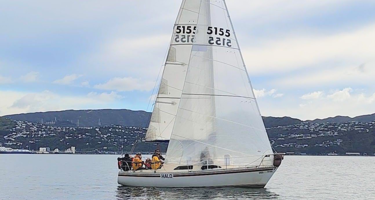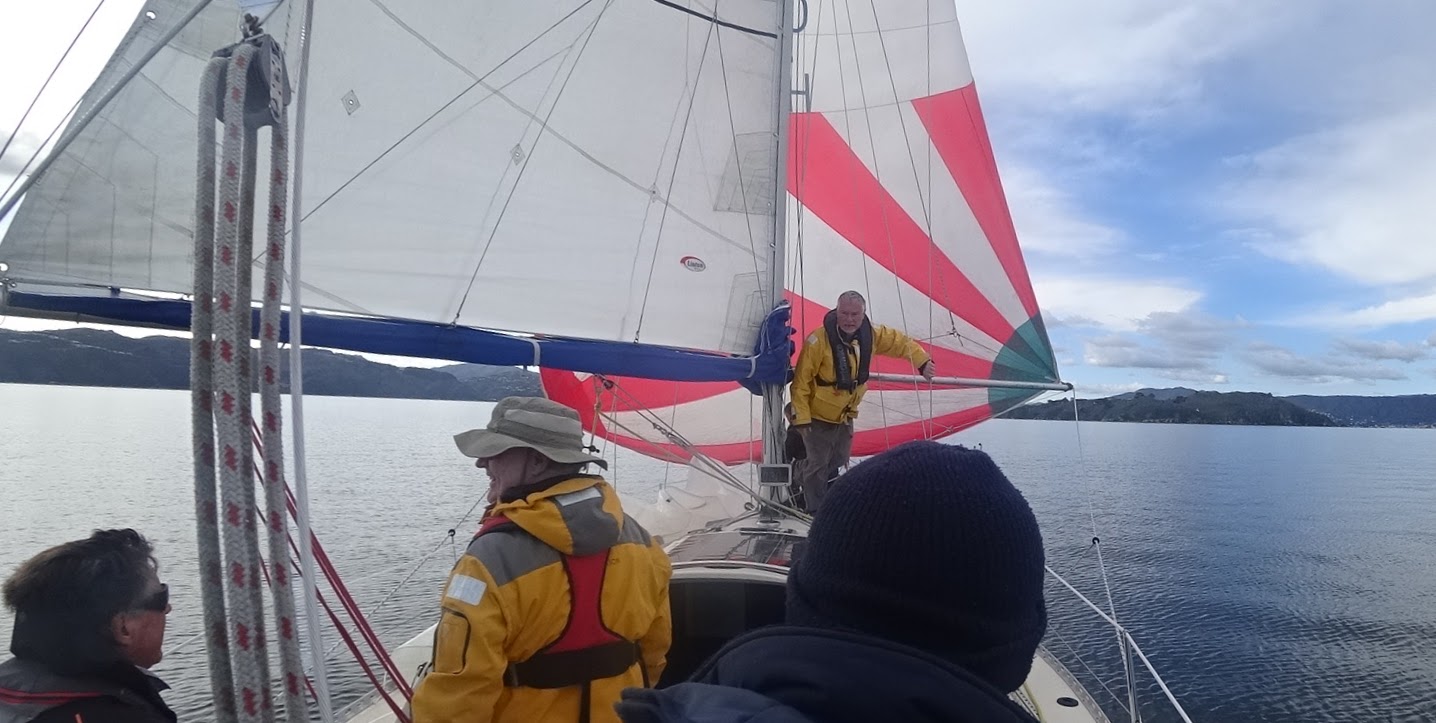 Peter, Jamie and Ryan joined me on Halo at Chaffers Marina and we cast off for the sail round to Evans Bay with our new genoa. With Ryan’s steady hand on helm we did some tests to see how the genoa performed upwind and downwind in the light airs of around 7 kts.