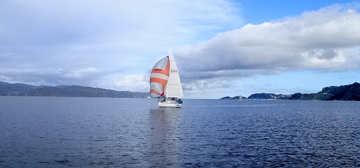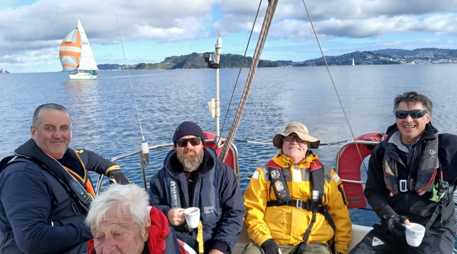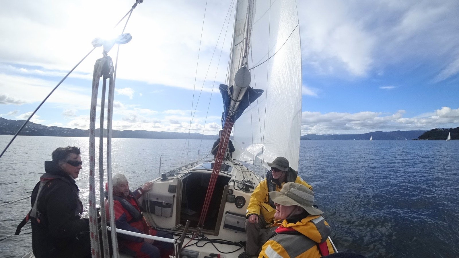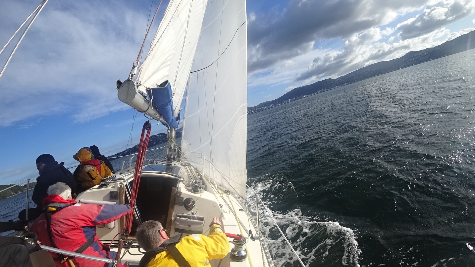Peter, Jamie and Ryan joined me on Halo at Chaffers Marina and we cast off for the sail round to Evans Bay with our new genoa. With Ryan’s steady hand on helm we did some tests to see how the genoa performed upwind and downwind in the light airs of around 7 kts.