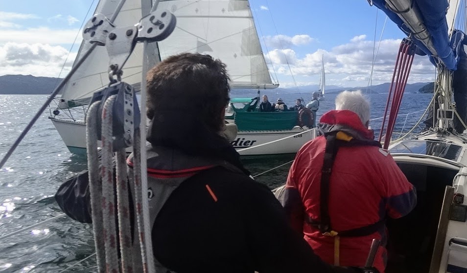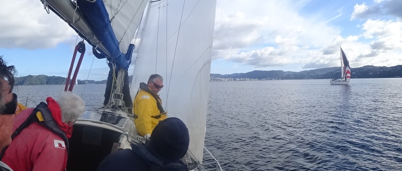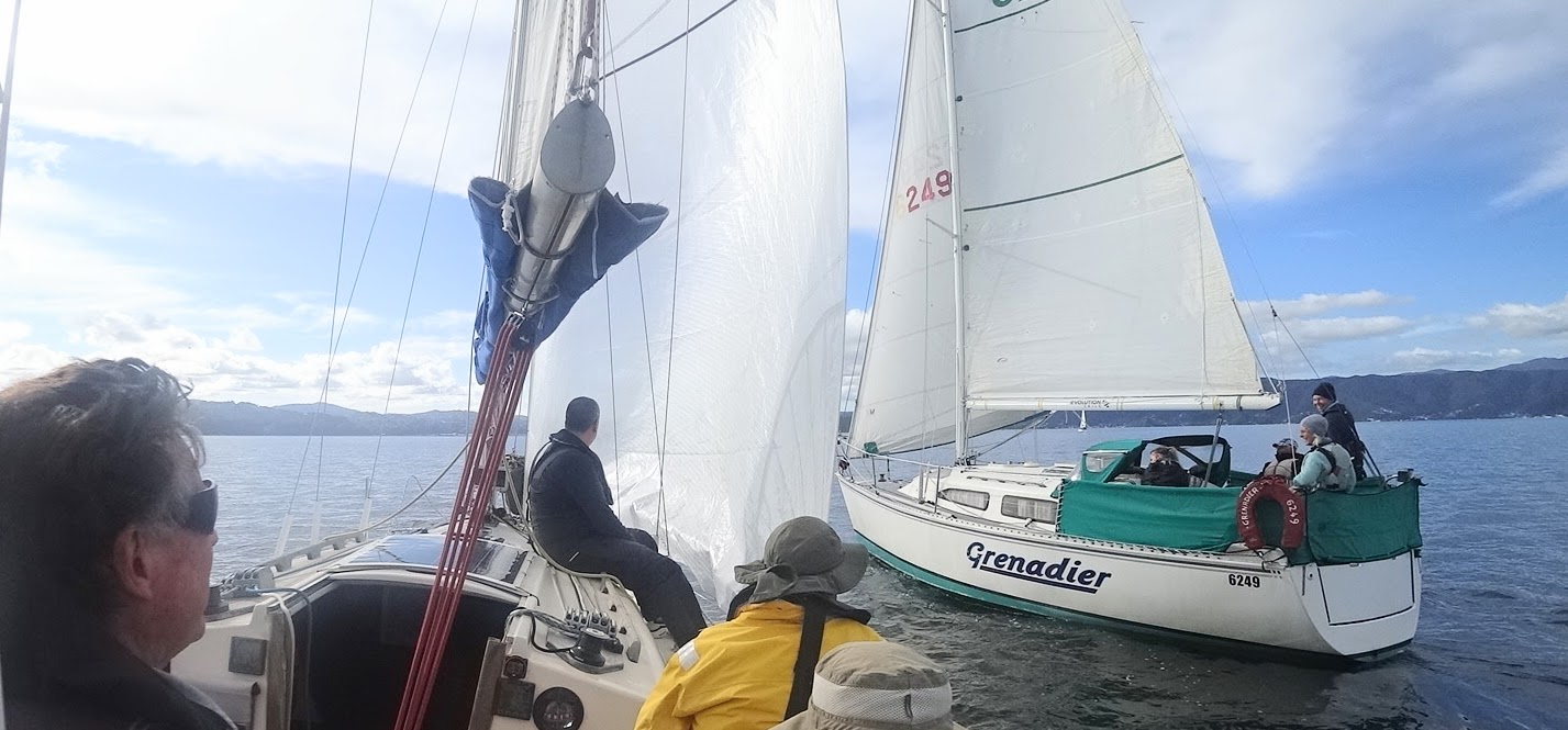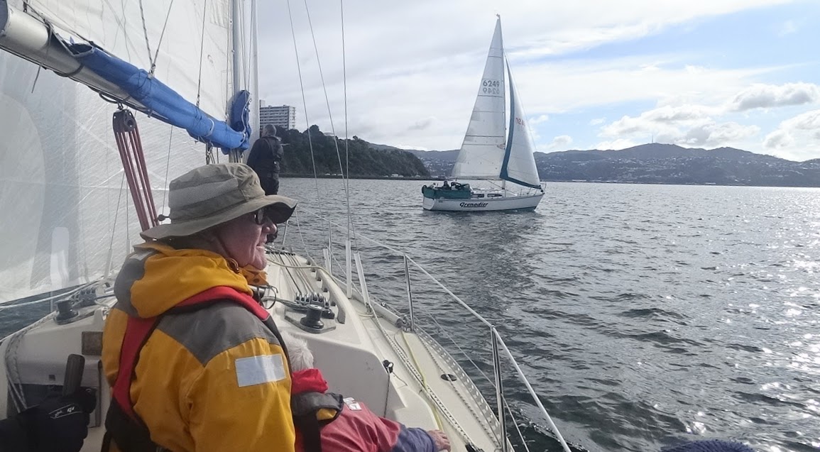 After two more tacks and heading towards Pt Halswell, Grenadier crossed towards us. They were on starboard tack with right-of-way and we dipped below them.