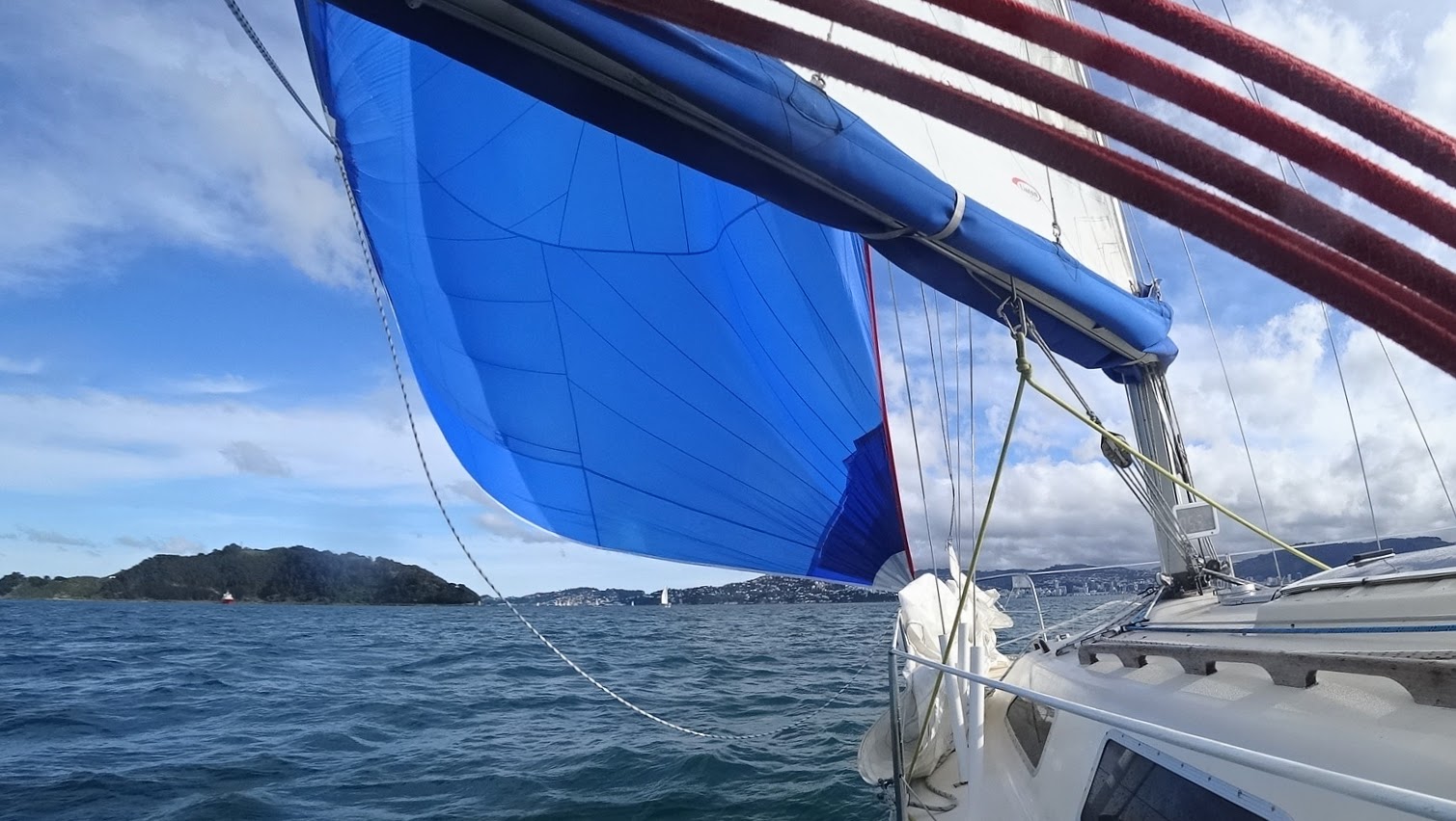 With the northerly averaging 15 kts we decided to try out the loaner gennaker for the run back to Evans Bay. First time we’ve used this sail in a race. The leg would be a broad reach initially.