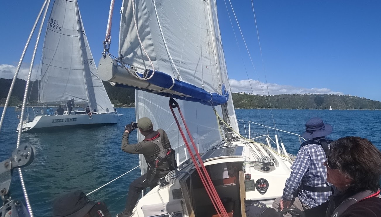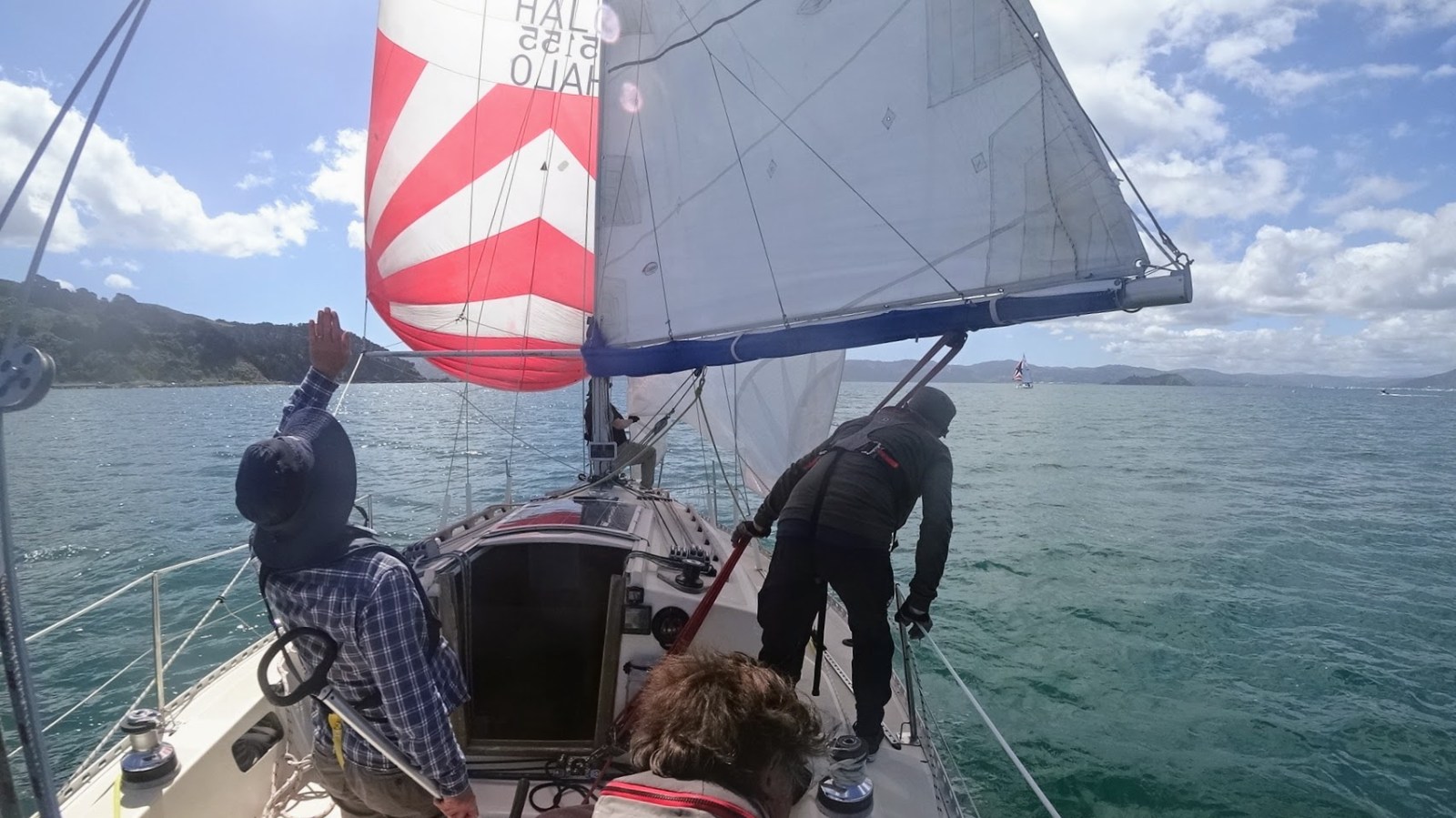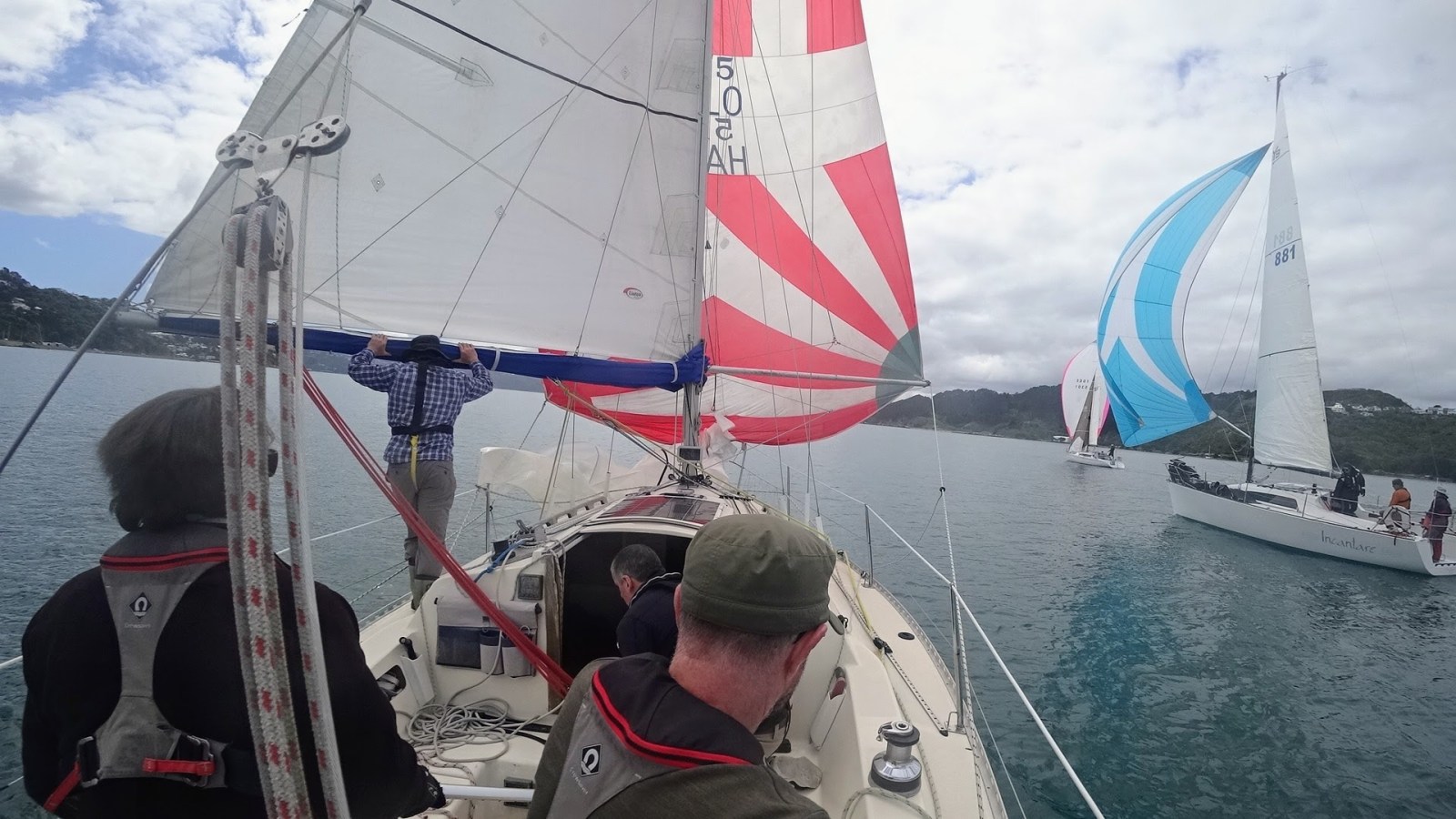 We rounded Pt Halswell expecting to have to avoid a big wind shadow but to our surprise we cruised through to a light breeze coming across Kau Bay. With the genoa quickly hoisted and kite down we got away nicely from Grenadier, Expresso and Incantare who were caught in a wind hole. “The hand of God“, Peter quipped.