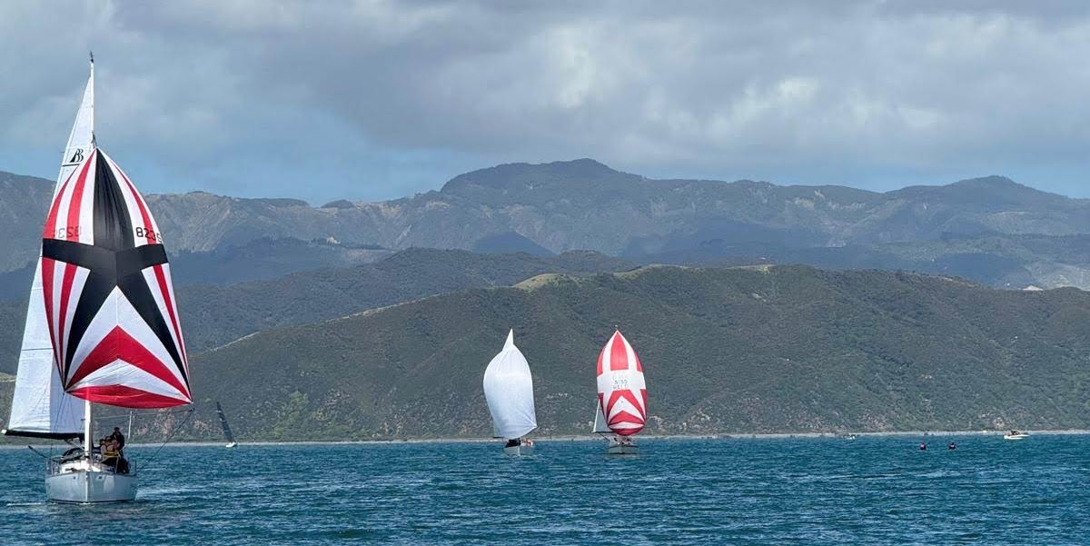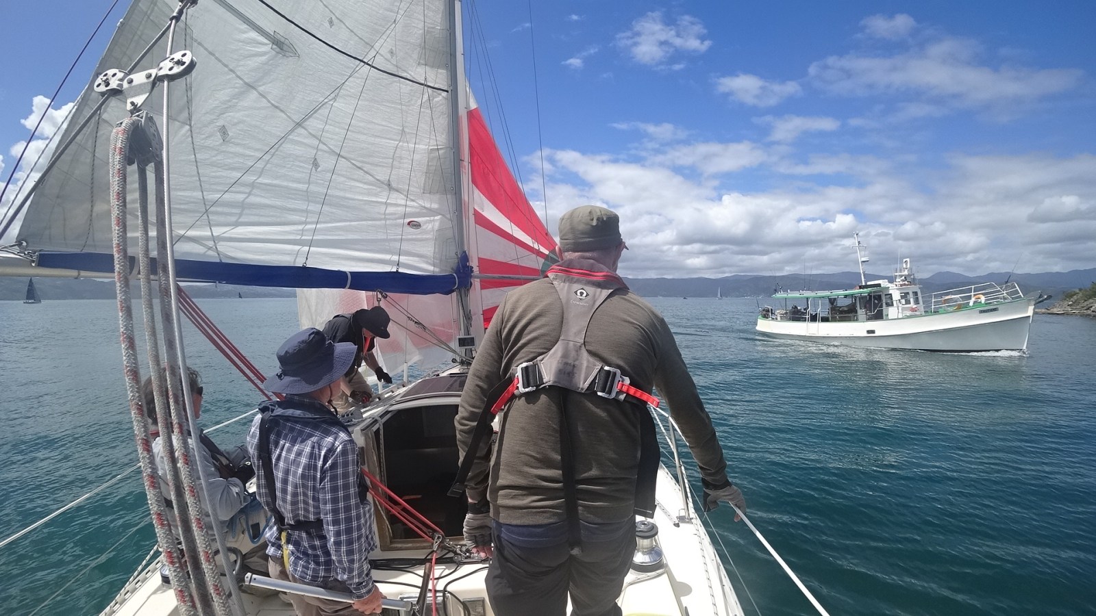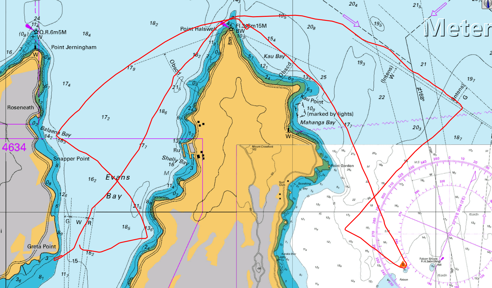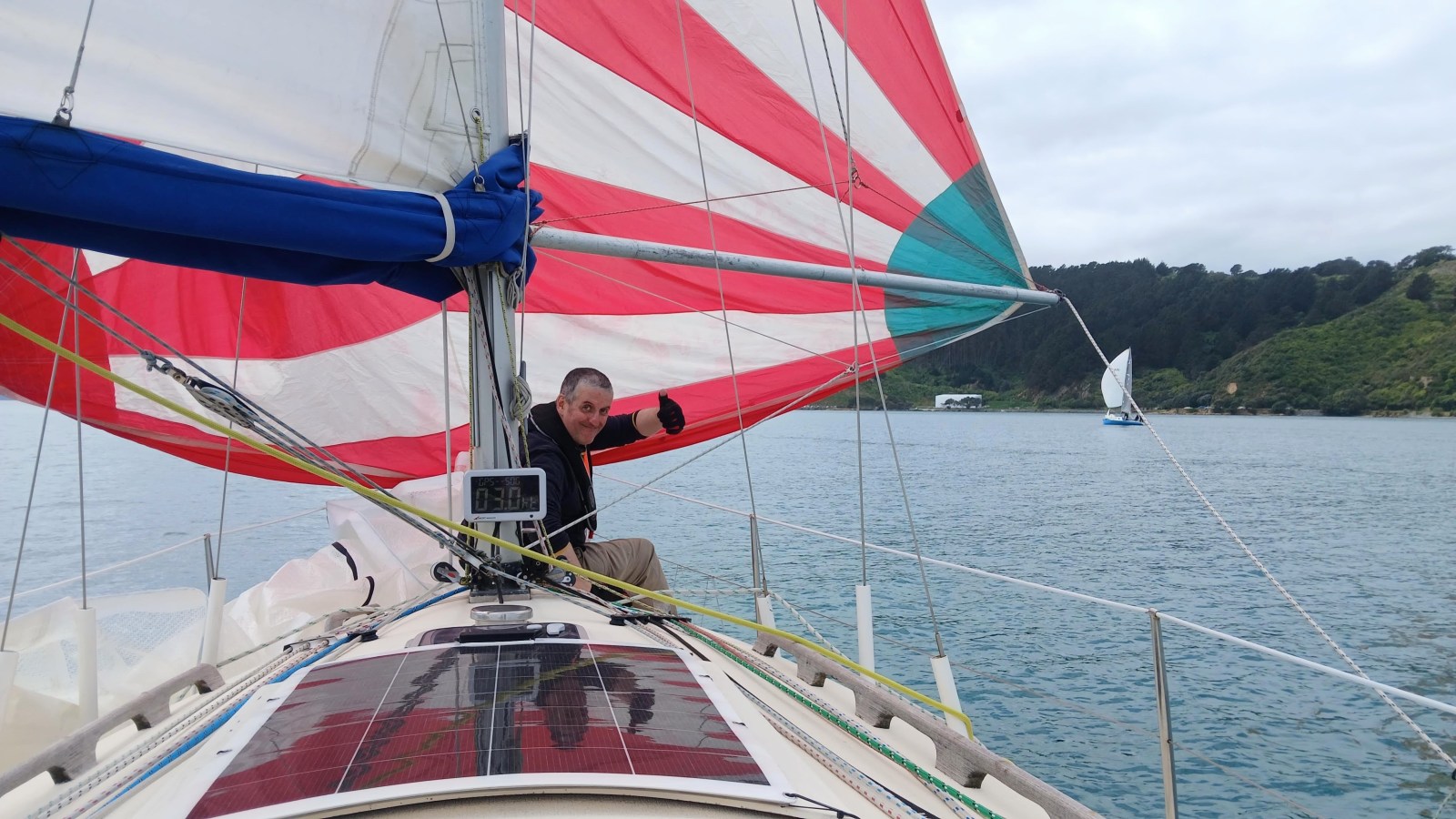 We rounded Pt Halswell expecting to have to avoid a big wind shadow but to our surprise we cruised through to a light breeze coming across Kau Bay. With the genoa quickly hoisted and kite down we got away nicely from Grenadier, Expresso and Incantare who were caught in a wind hole. “The hand of God“, Peter quipped.