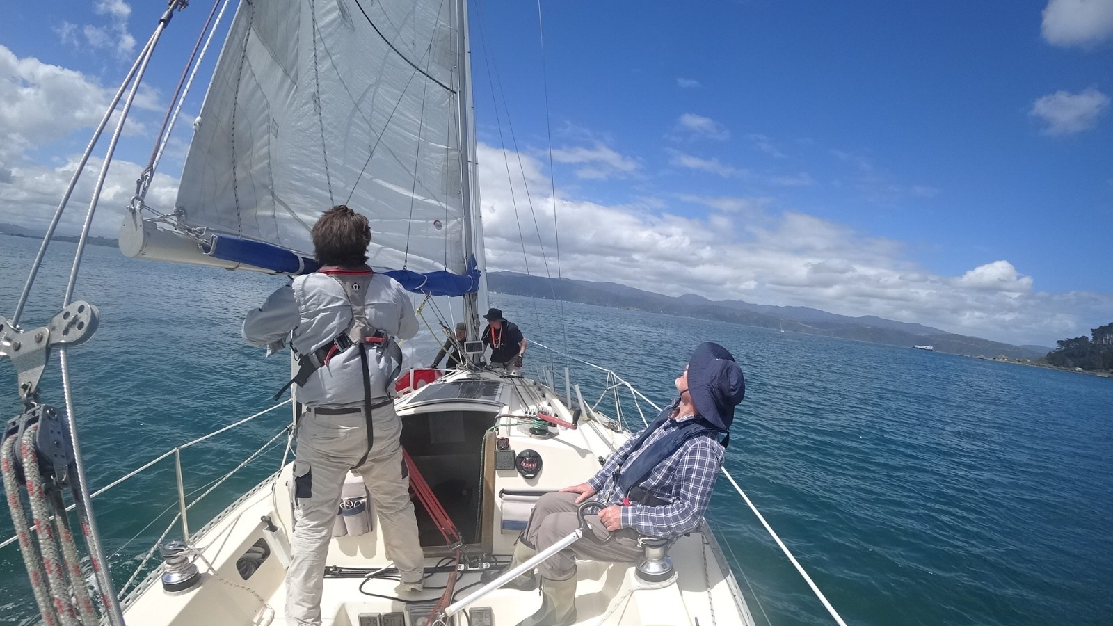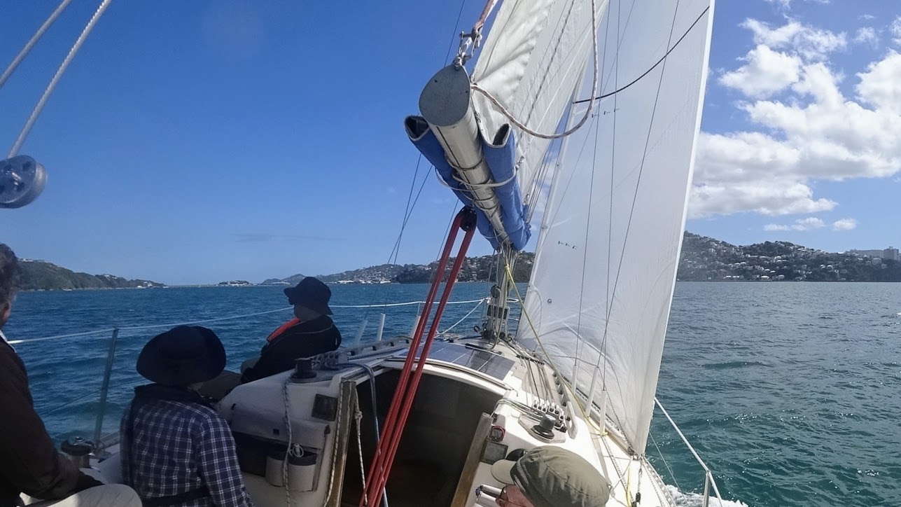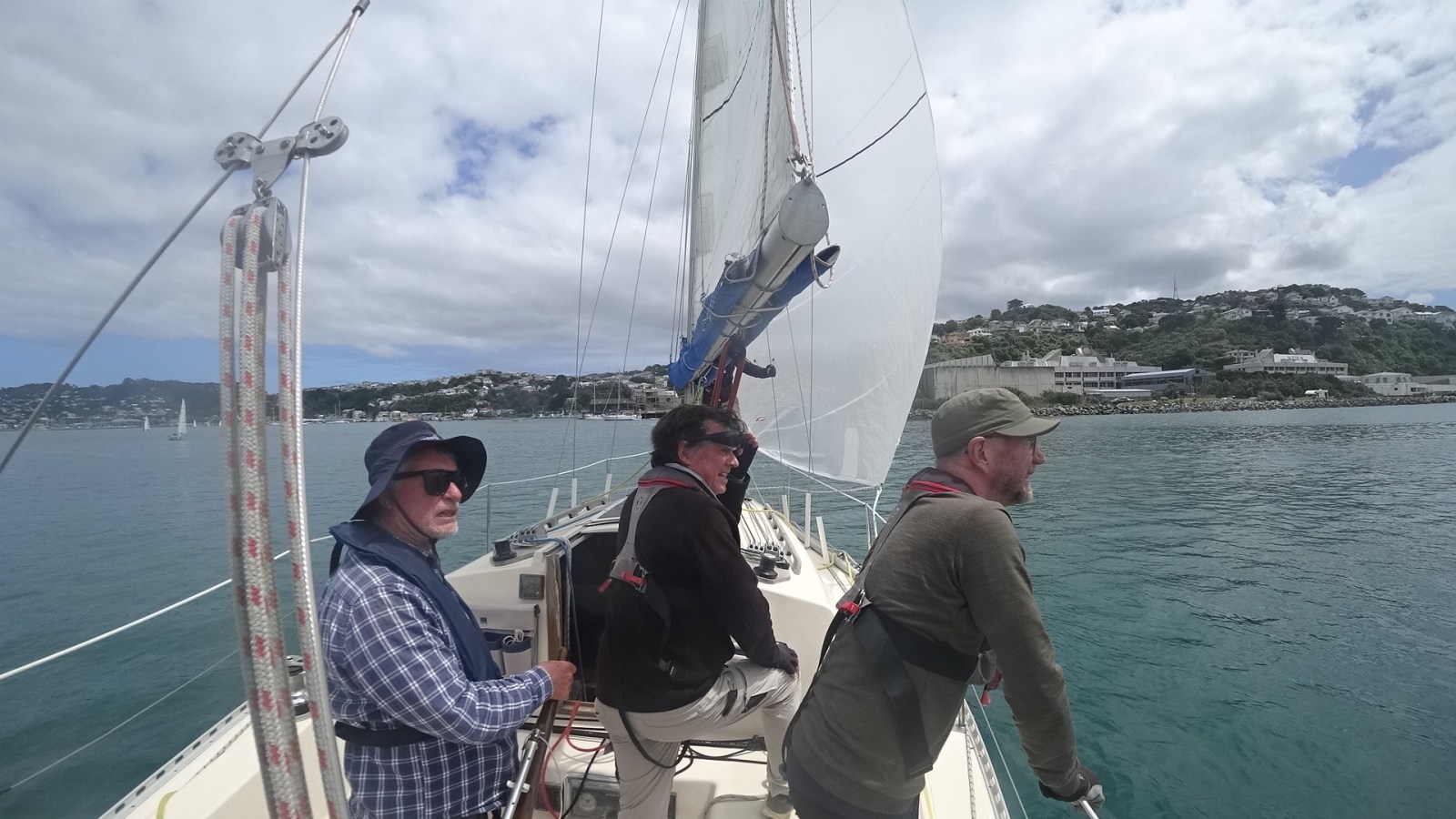 With Malcolm and Jamie on board and our new no. 1 genoa hoisted, we sailed round to Evans Bay where Peter was waiting for us.