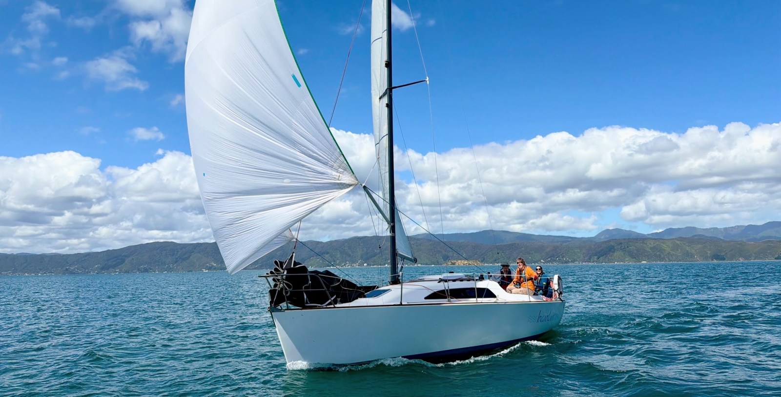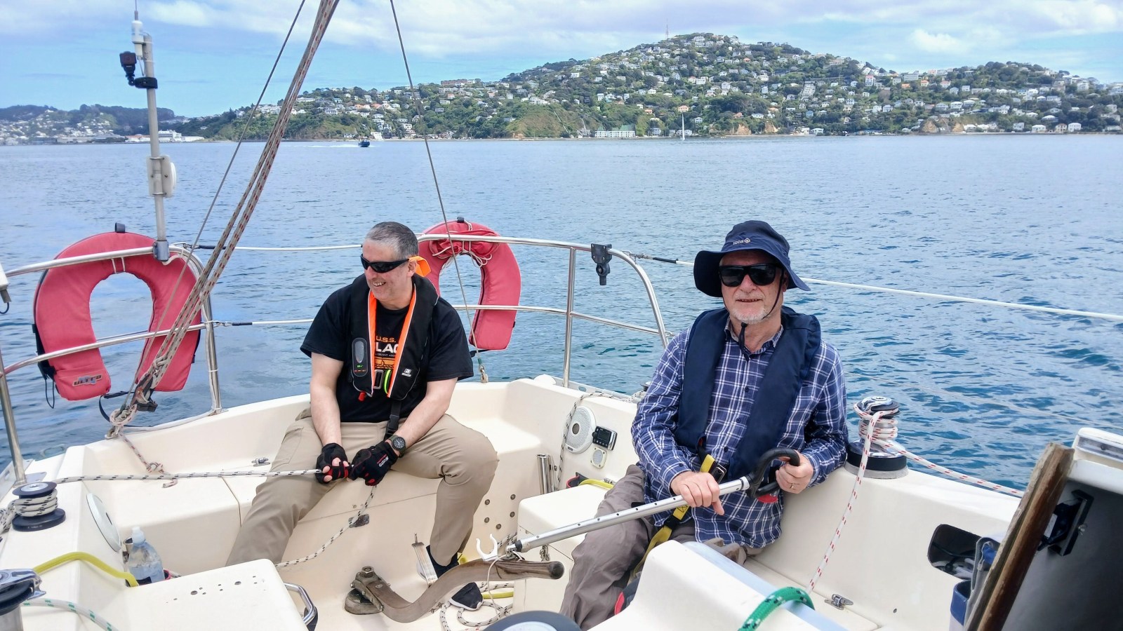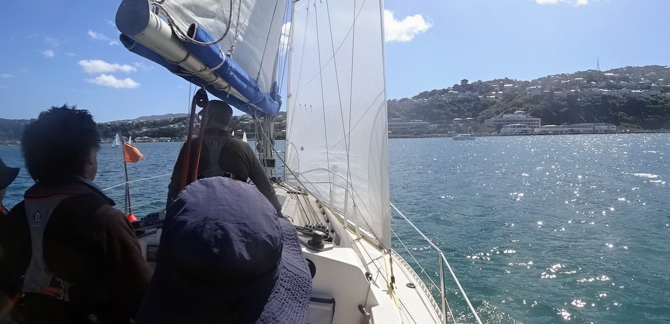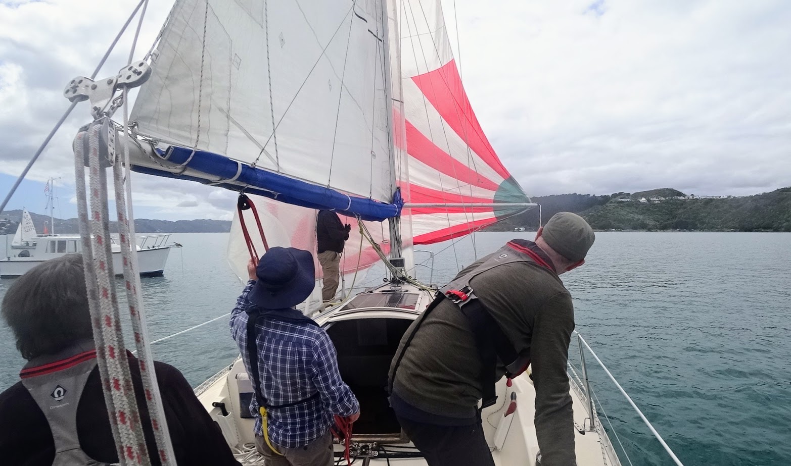 With Malcolm and Jamie on board and our new no. 1 genoa hoisted, we sailed round to Evans Bay where Peter was waiting for us.