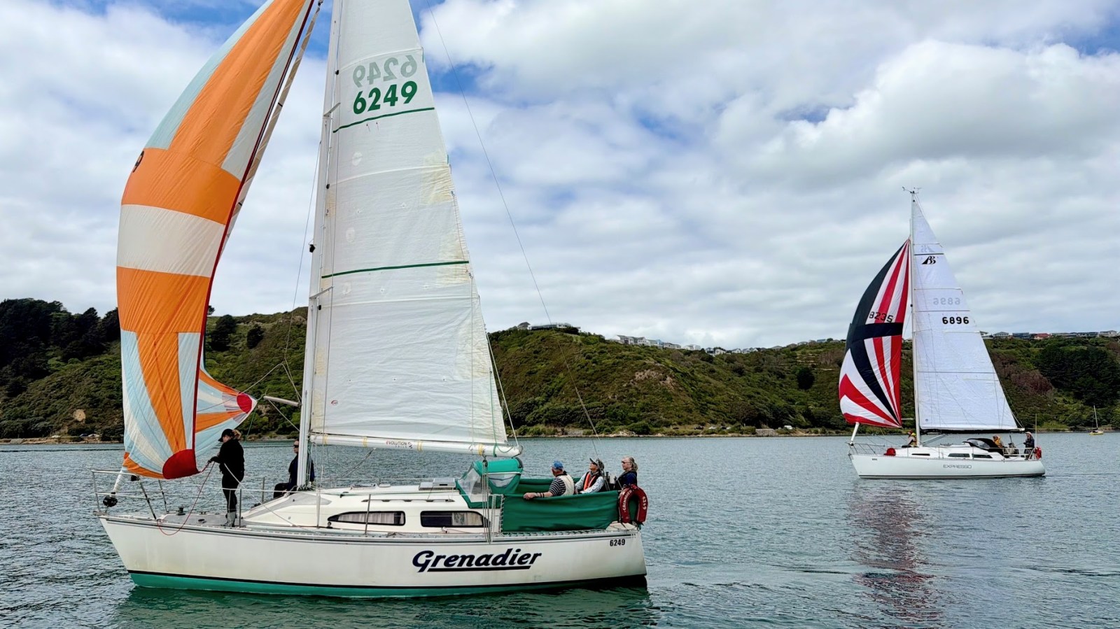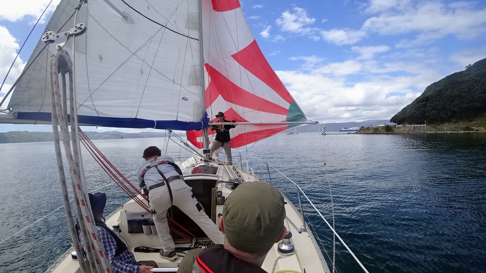Jamie rigged up the maxi spinnaker ready for a downwind start and we motored out to Greta Point. Race officer Rick Martin was on Pania. We waited for him to hoist our green class flag.