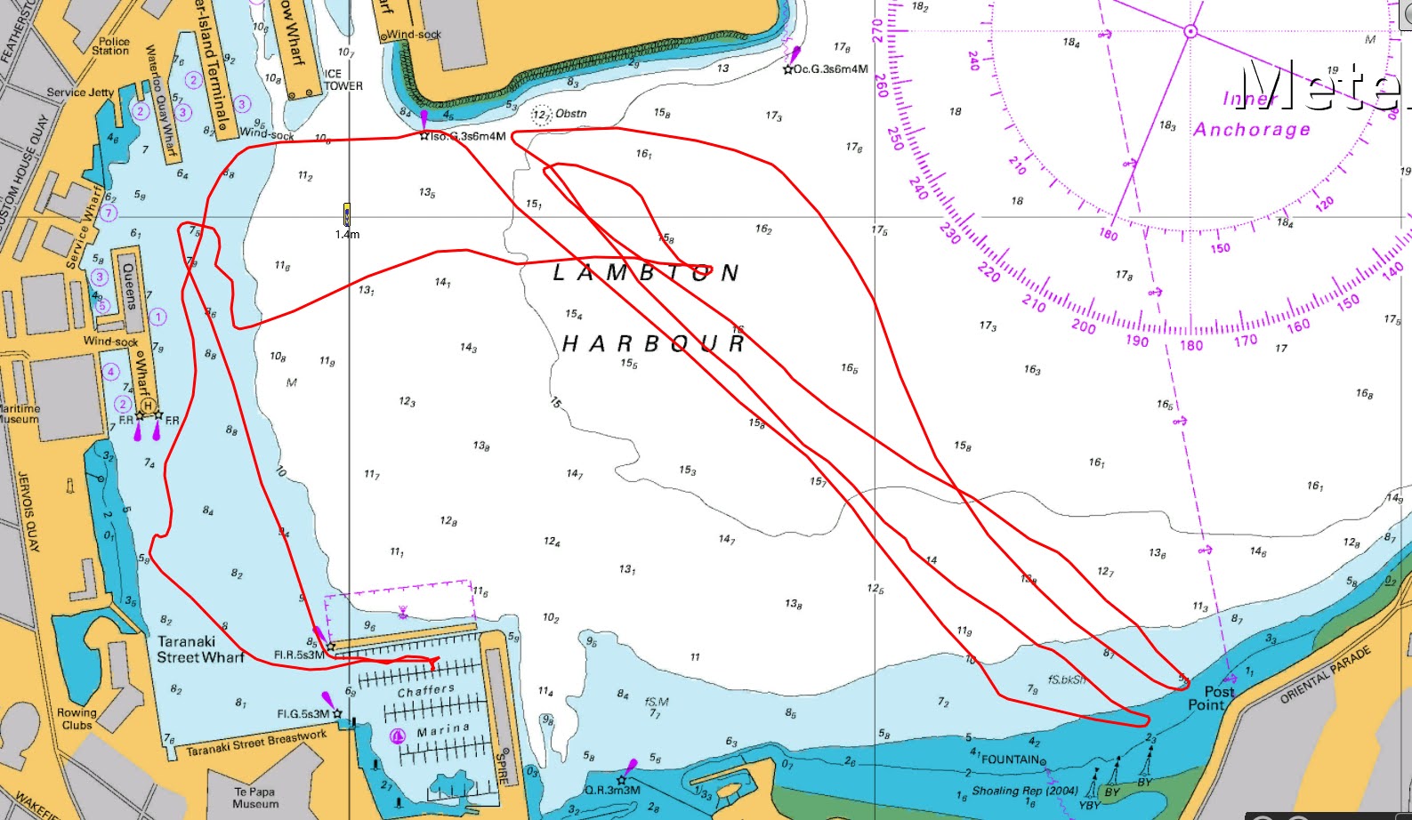 It was pretty windy as we cast off from Chaffers Marina at 1020 hrs. We put a reef in the mainsail, hoisted our small no. 3 jib, and had fun sailing within the relatively sheltered inner harbour between Oriental Bay and the Container Terminal.
