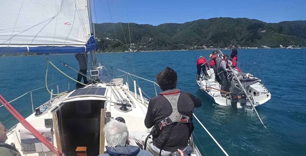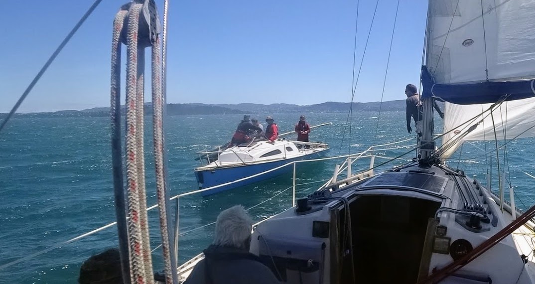 After a circling round them a few times Craig later confirmed that they had their outboard motor working and would motor back to Evans Bay. We updated Maritime Radio and EB race control and continued our race.