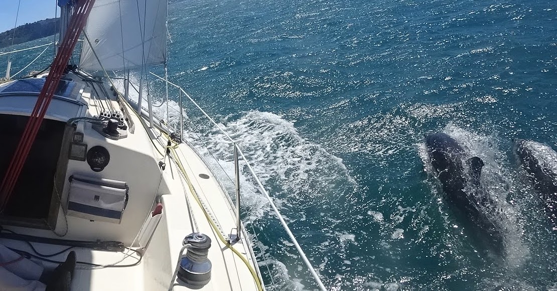 It was now blowing consistently over 20 kts. We put a reef in the mainsail and enjoyed the company of a pod of dolphins as we sailed across the harbour.