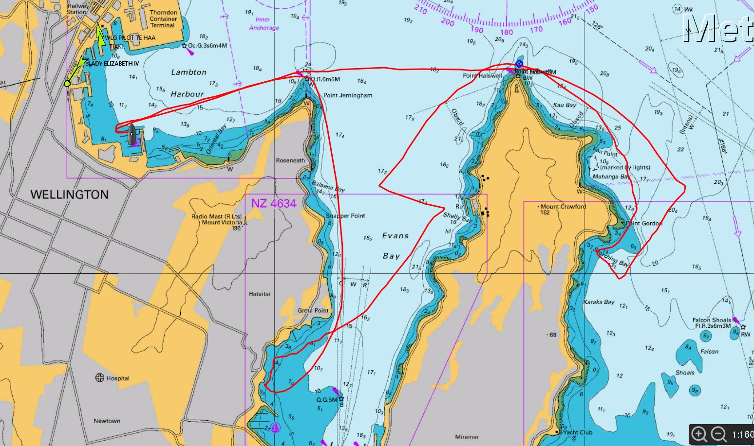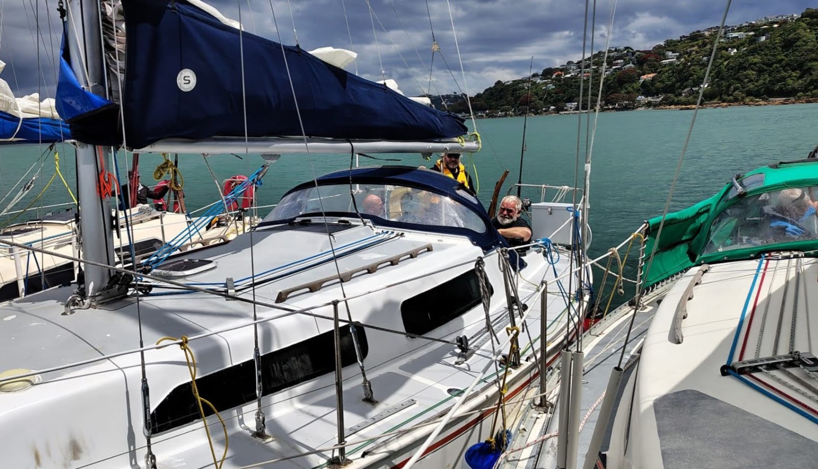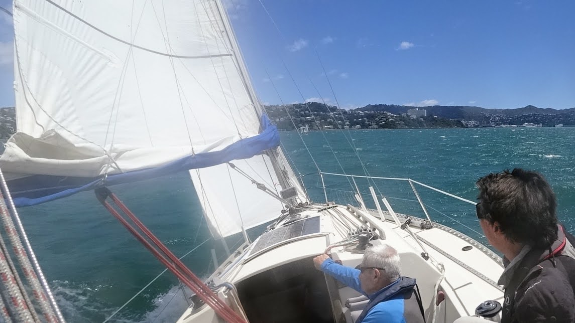 We cast off at 1240 hrs and began hoisting the mainsail and No. 3 jib — only to discover the wind had other ideas and was now blowing a solid 20 knots. A quick reef went into the main for a rather wild ride up Evans Bay towards Pt Halswell.