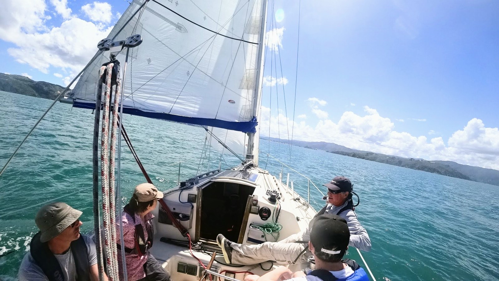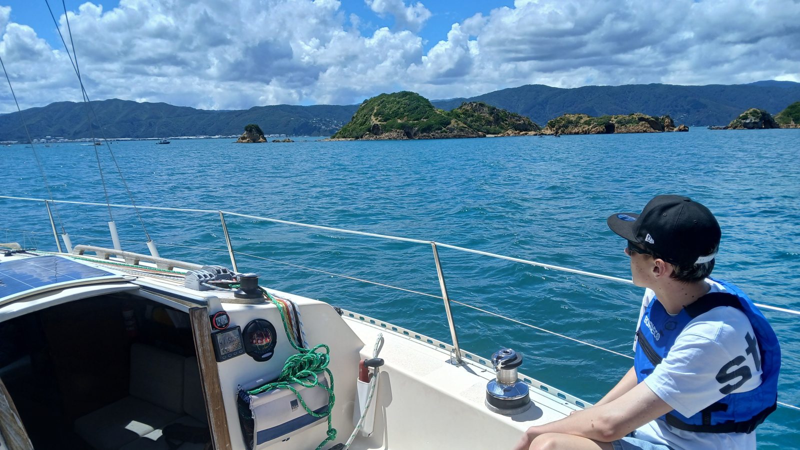 Things improved nicely by the time we reached Pt Jerningham, with the southerly filling in to a steady 10 knots. Lucas took over on the helm and we enjoyed a pleasant beam reach up the harbour toward Somes Island — always a great way to sail.