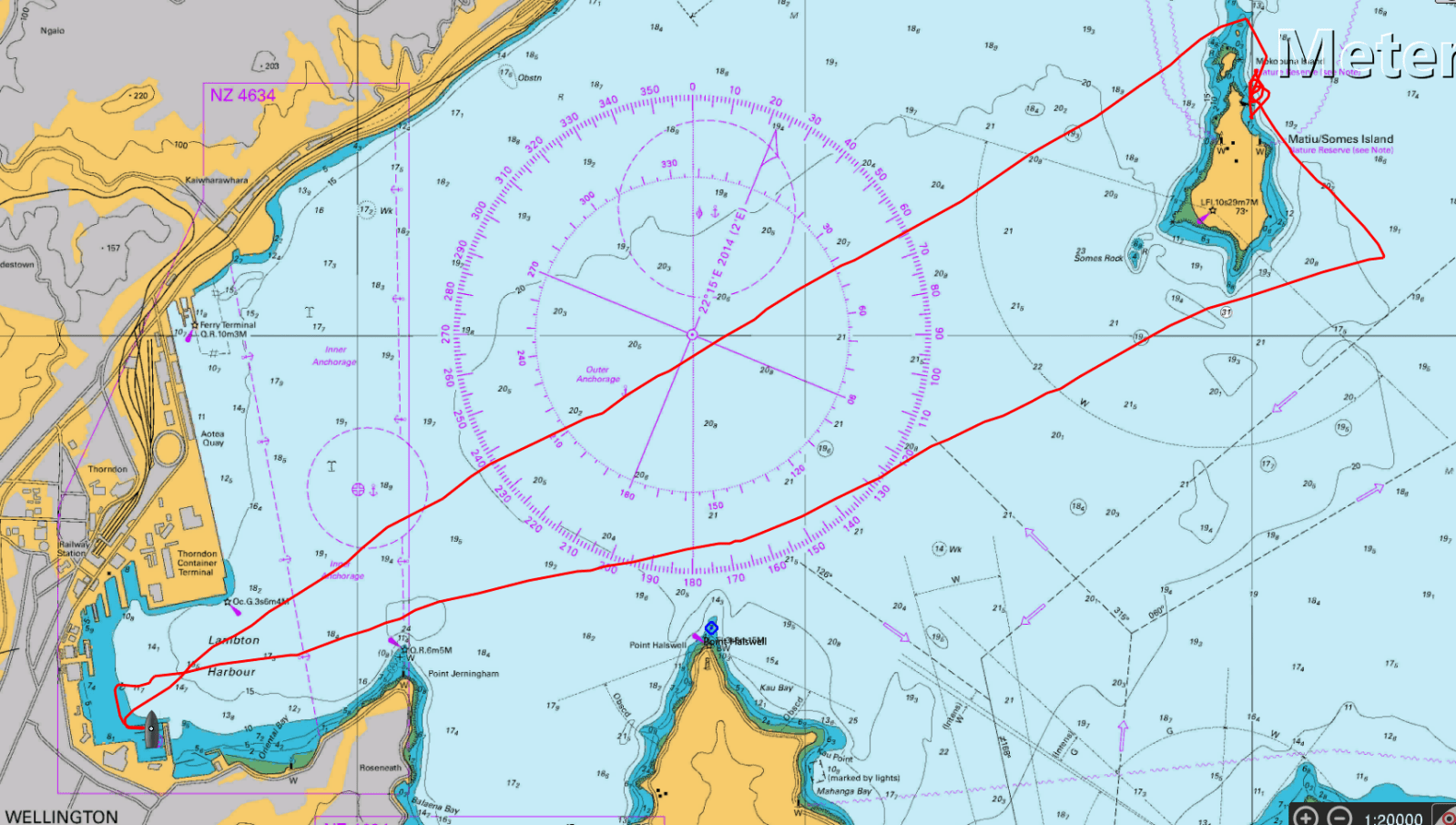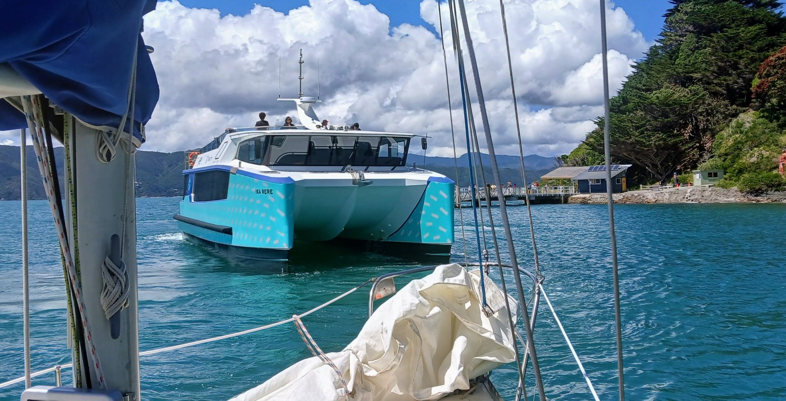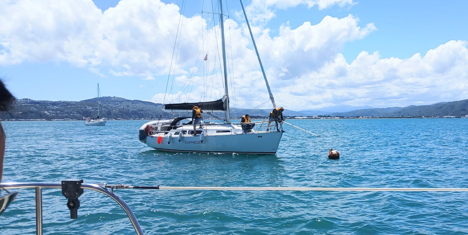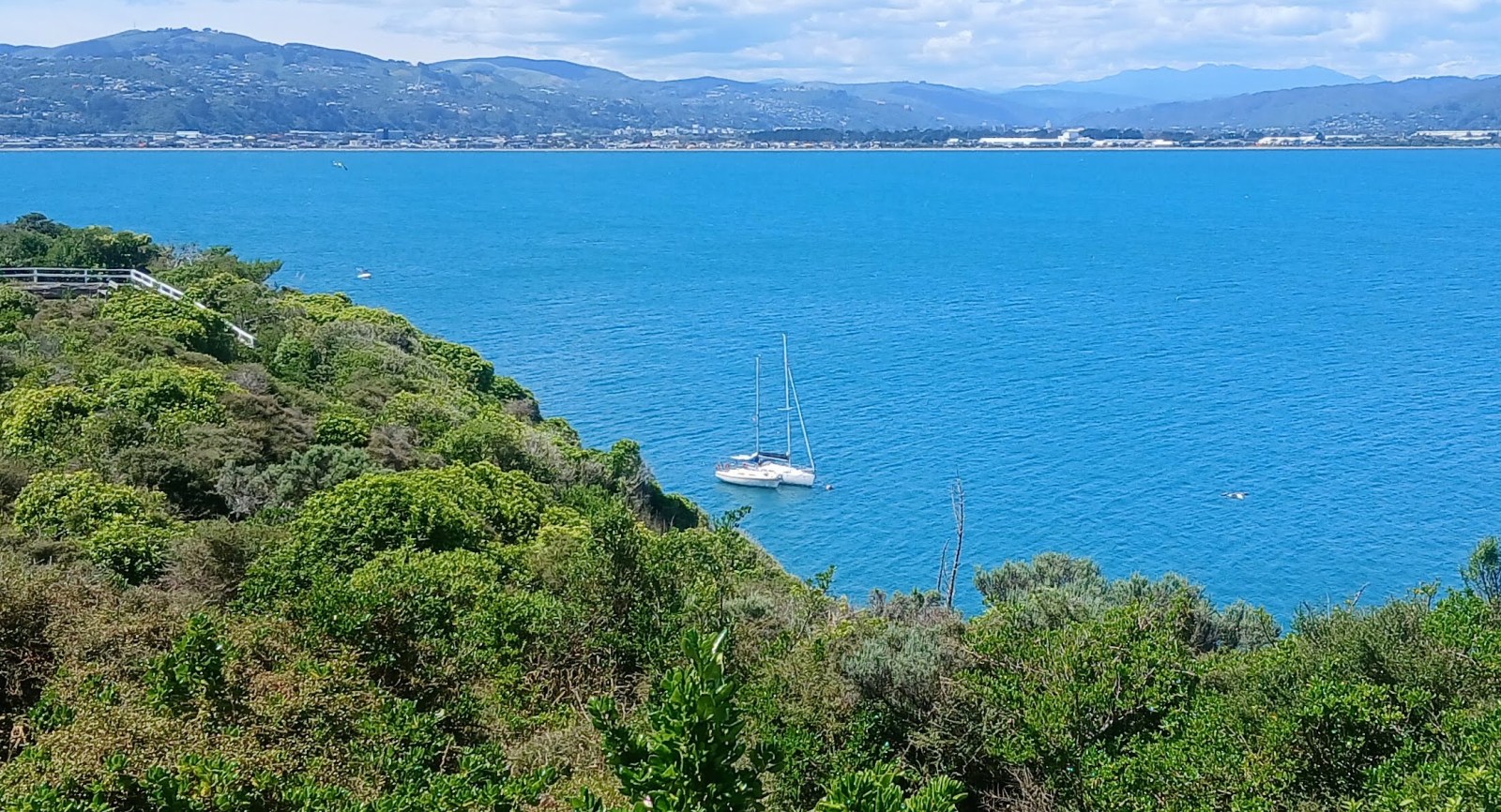 We dropped the anchor in around 6 metres of water and were just checking our holding when Ika Rere, the electric East–West ferry, appeared rather close for comfort! The skipper politely let us know that anchoring within 50 metres of the yellow buoys was a no-go area. Apparently that’s because Somes Island gets its fresh water from a bore into the Waiwhetu Aquifer beneath the harbour — something we all learned that day!