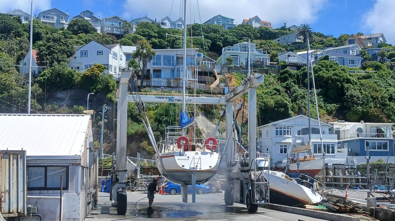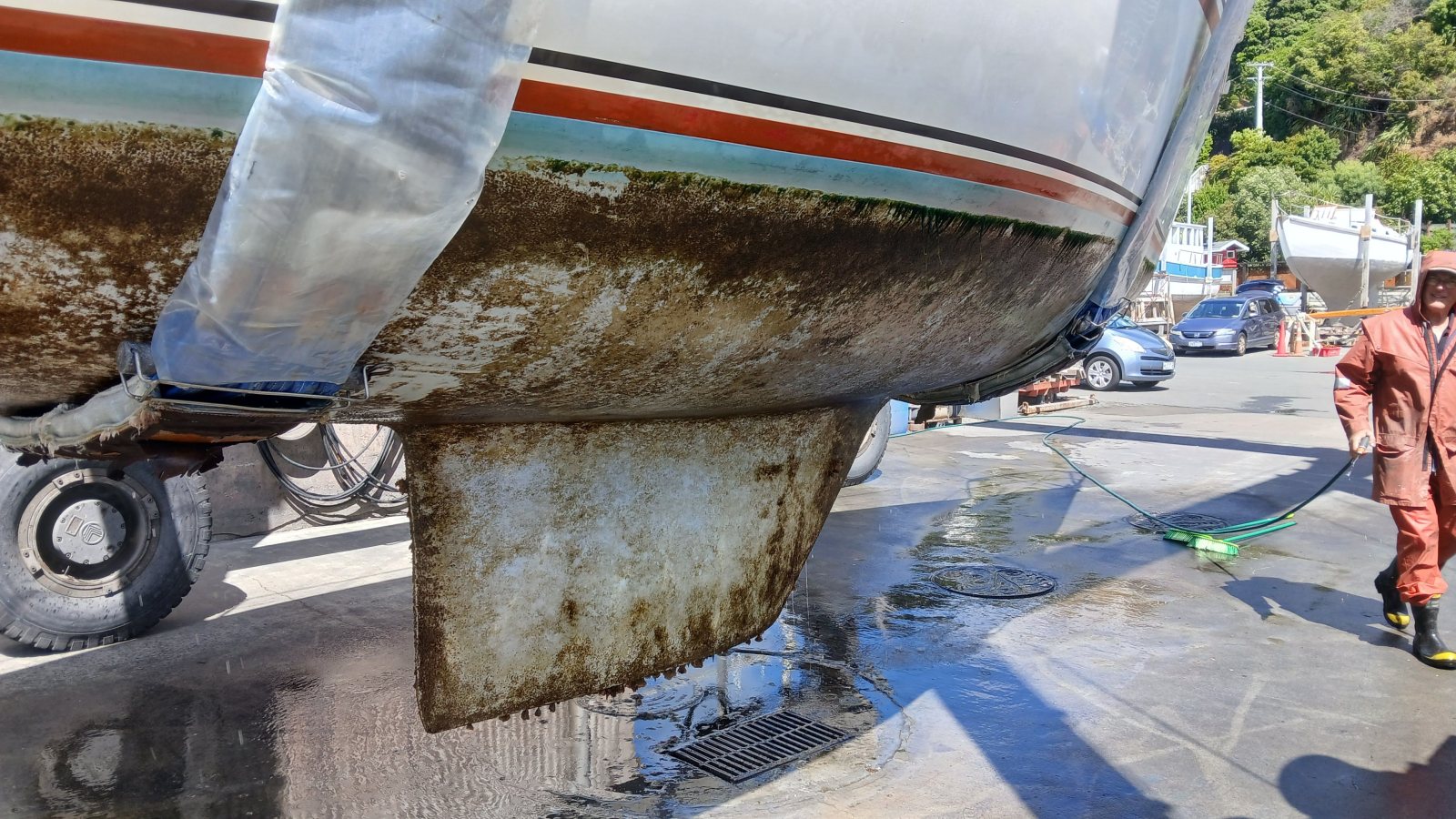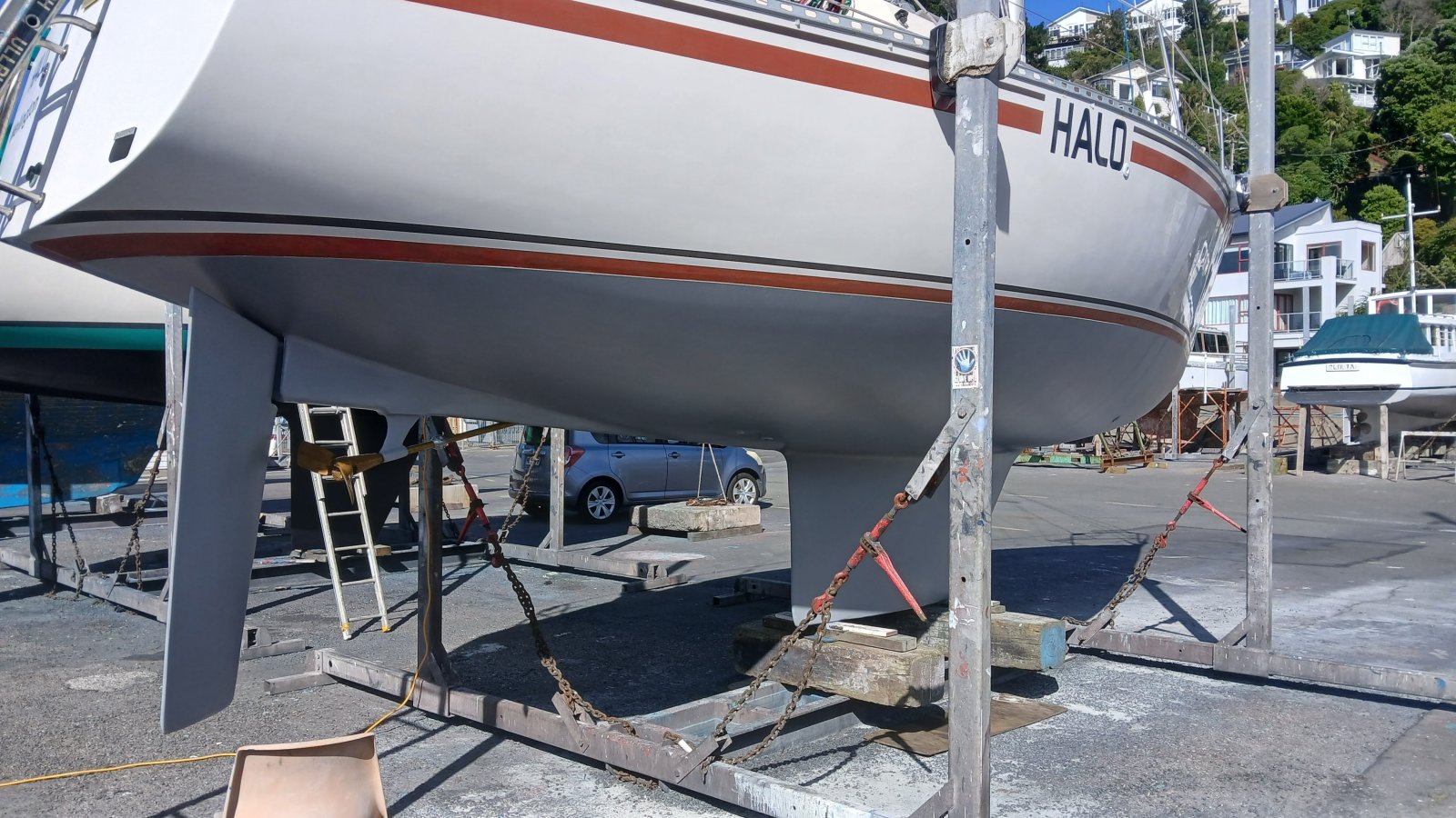Sven then water-blasted the hull and moved Halo with the travel lift into a cradle in the yard, ready for the antifoul work.