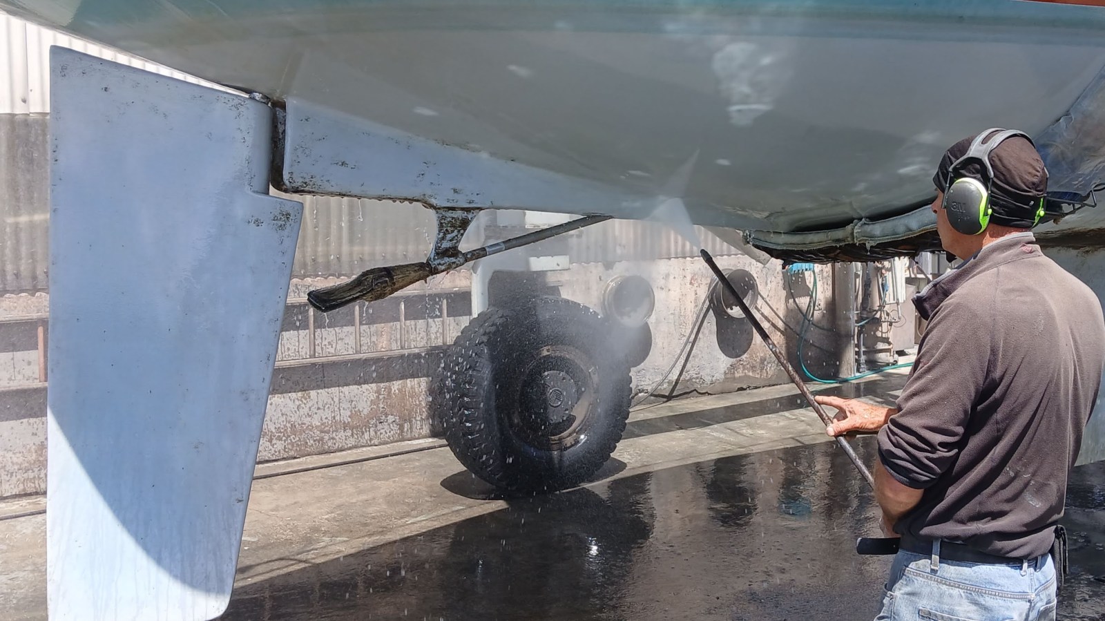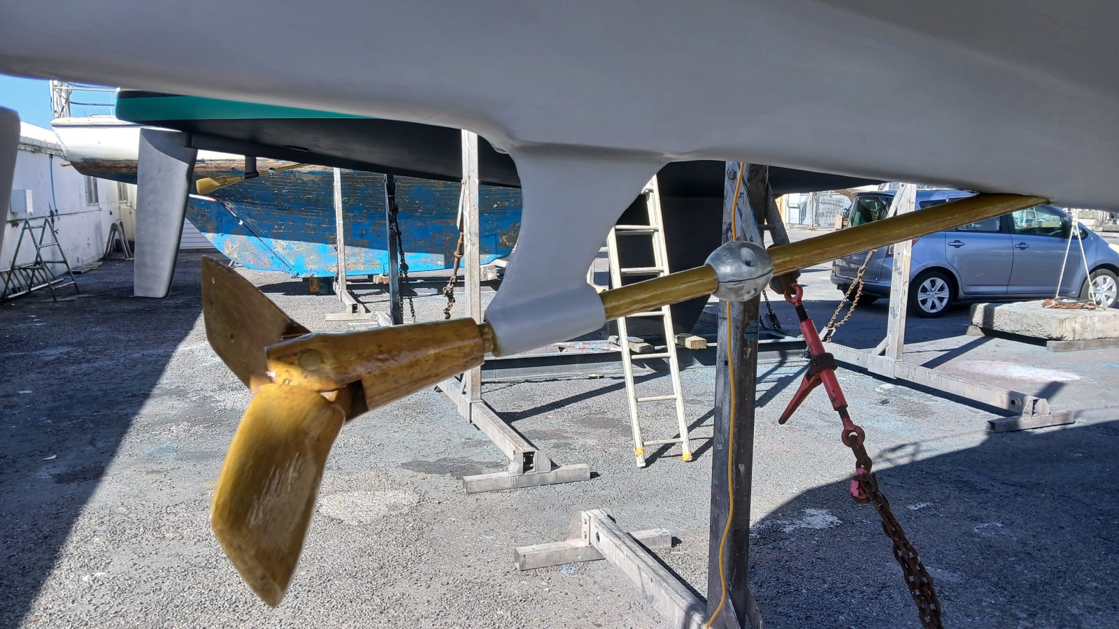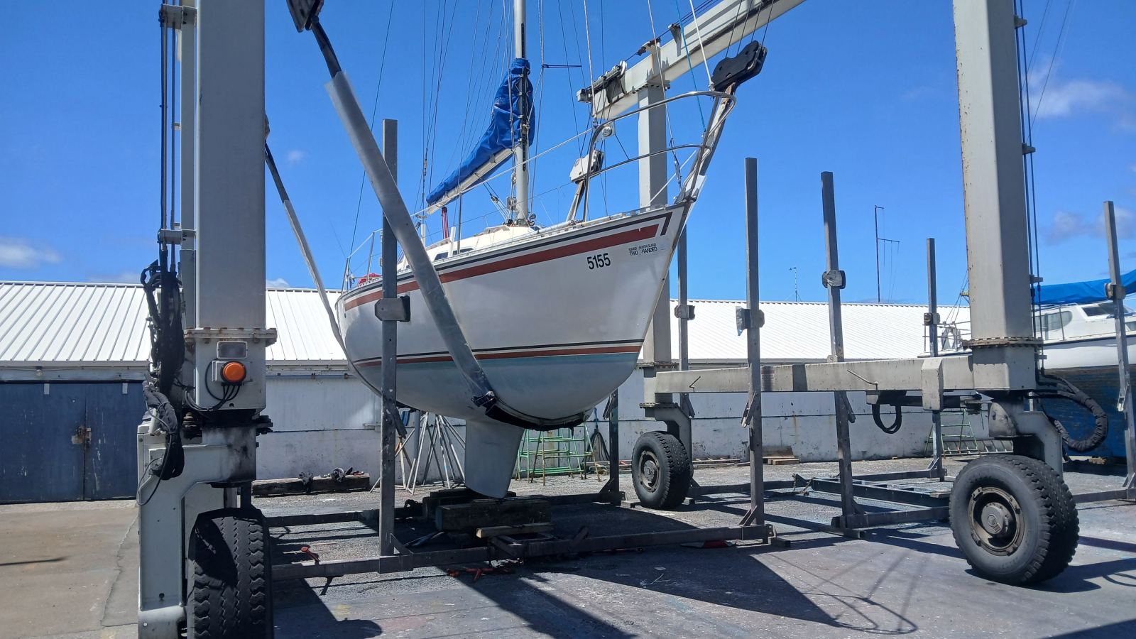 Sven then water-blasted the hull and moved Halo with the travel lift into a cradle in the yard, ready for the antifoul work.