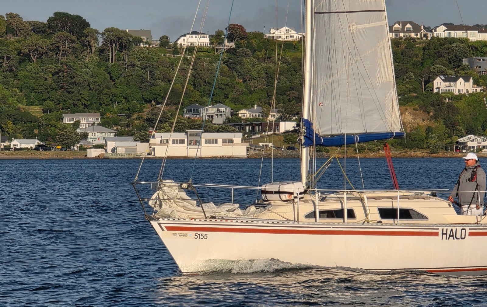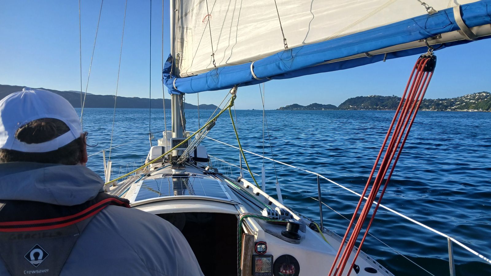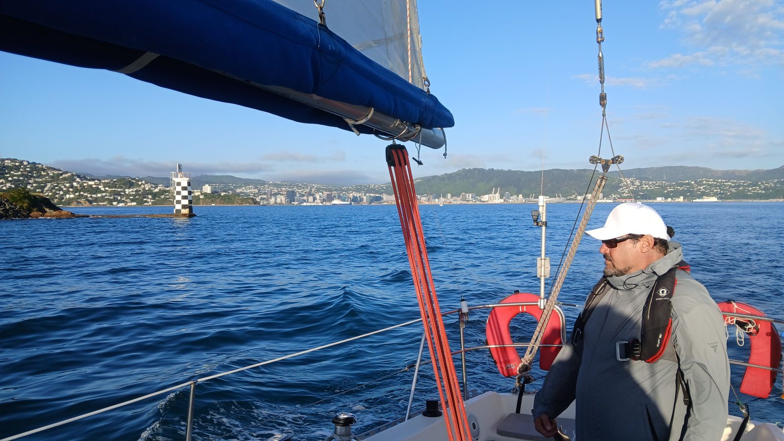 Turning west past the Atatürk Memorial above Tarakena Bay, we hoisted the No. 3 jib with a full main and sailed past Lyall Bay and Island Bay. After passing Sinclair Head we entered the infamous Karori Rip, living up to its “washing machine” reputation.