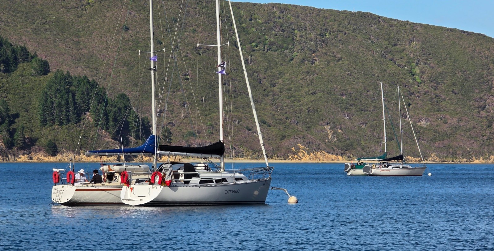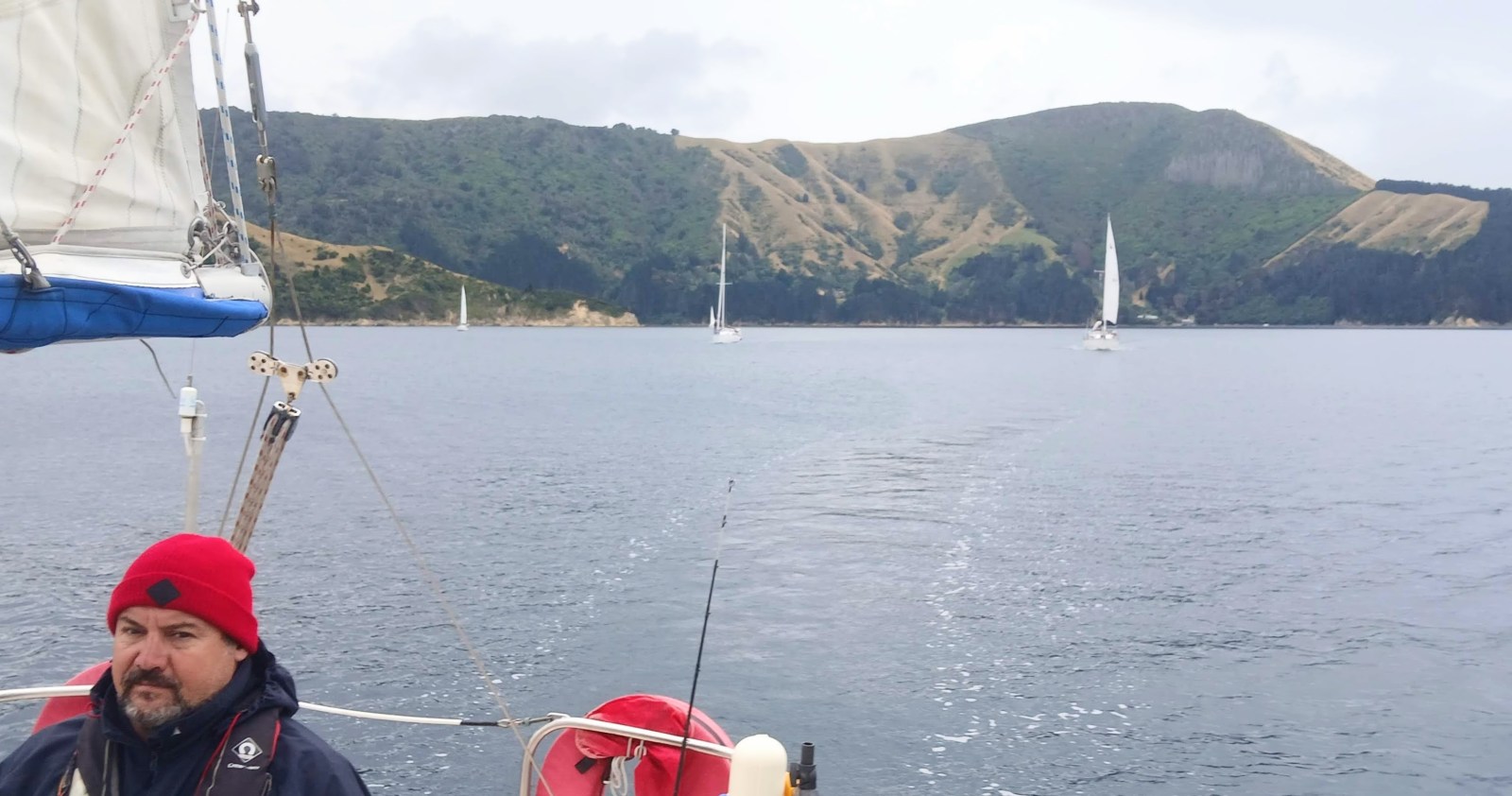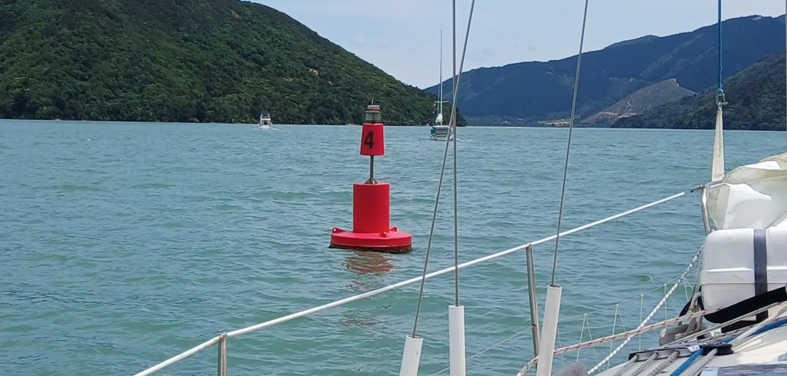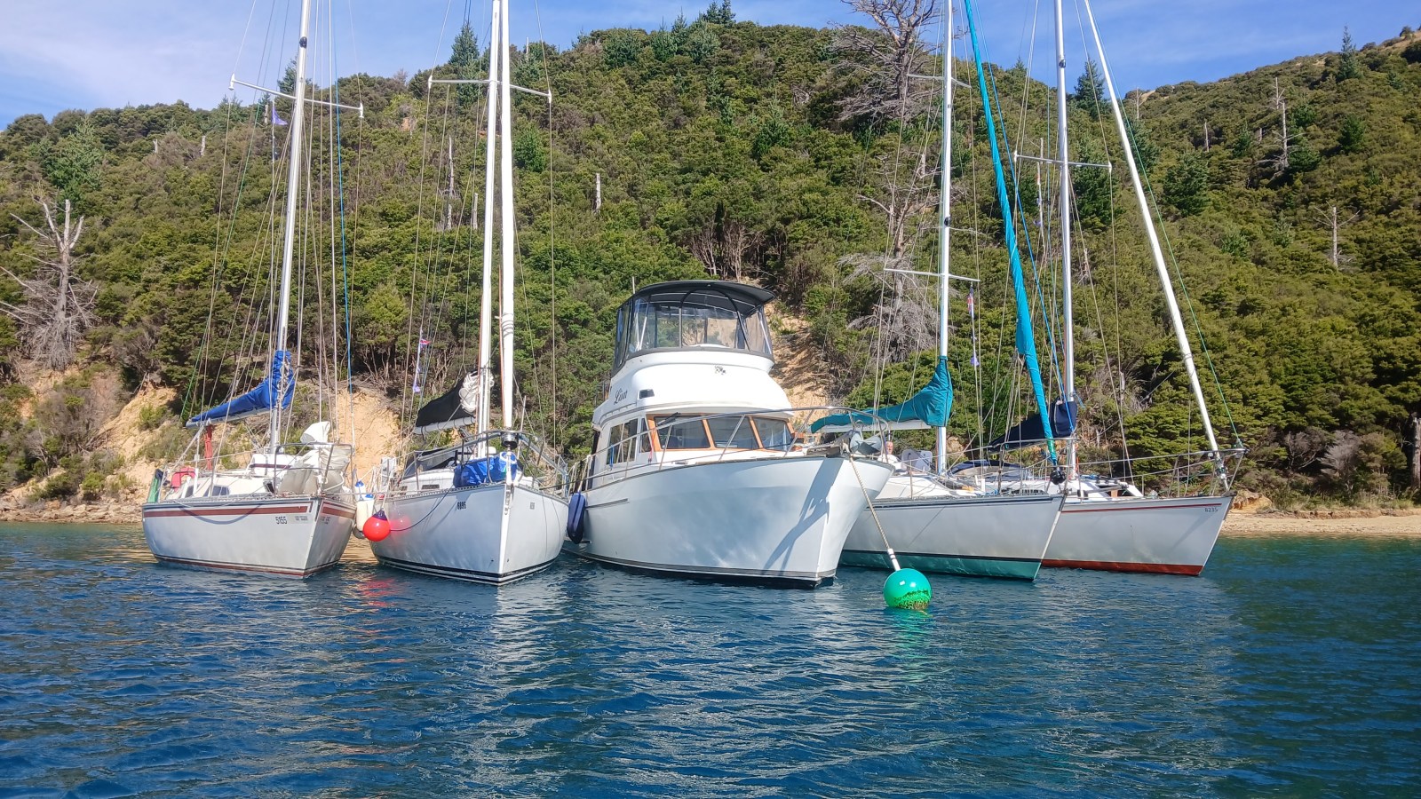 Under overcast skies we alternated between sailing and motor-sailing out of Pelorus Sound, past the Chetwode Islands and Clay Point, before entering Admiralty Bay. We arrived at Catherine Cove at 1140 hrs, where I had called ahead to confirm mooring availability — one for each boat.