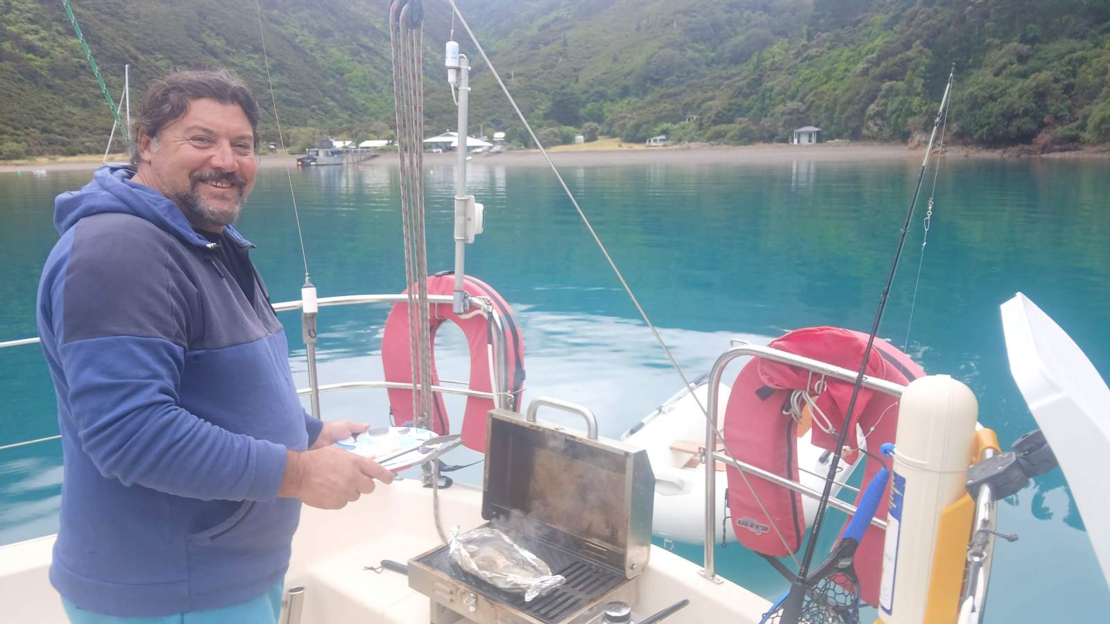 Tunch had been busy fishing, landing gurnard, blue cod — and the occasional baby shark. Dinner was cooked on the BBQ, followed by a balmy evening of socialising and ukulele.