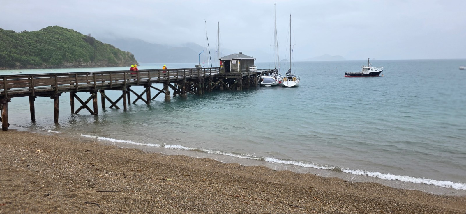 Our final day. We cast off at 0930 hrs, and at last the rain eased as we motor-sailed down Admiralty Bay toward French Pass village at Elmslie Bay in a light southerly. We tied up at the wharf, two boats on each side.