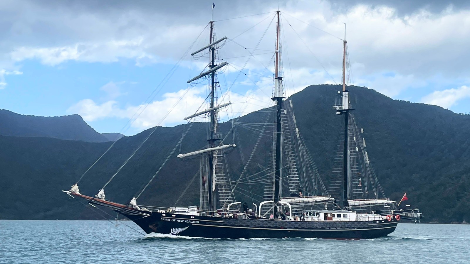 Sailing up Hikapu Reach, we crossed paths with the majestic Spirit of New Zealand tall ship — a marvellous sight.