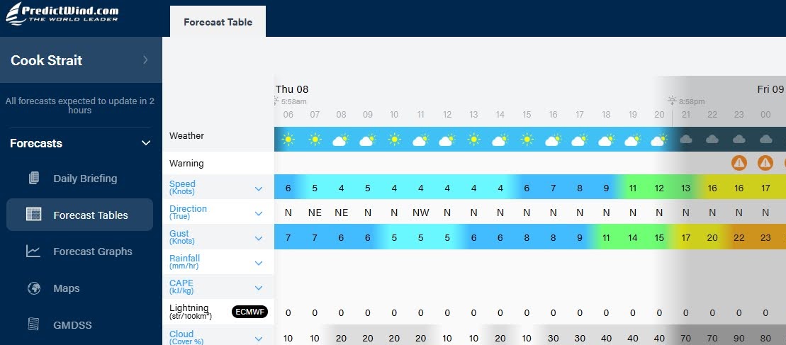MetService: Northerly 20 knots easing to variable 10 knots in the morning, then northerly 14 knots developing late afternoon and rising to 25 knots overnight.