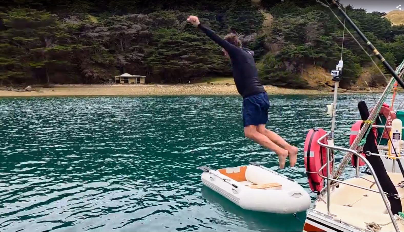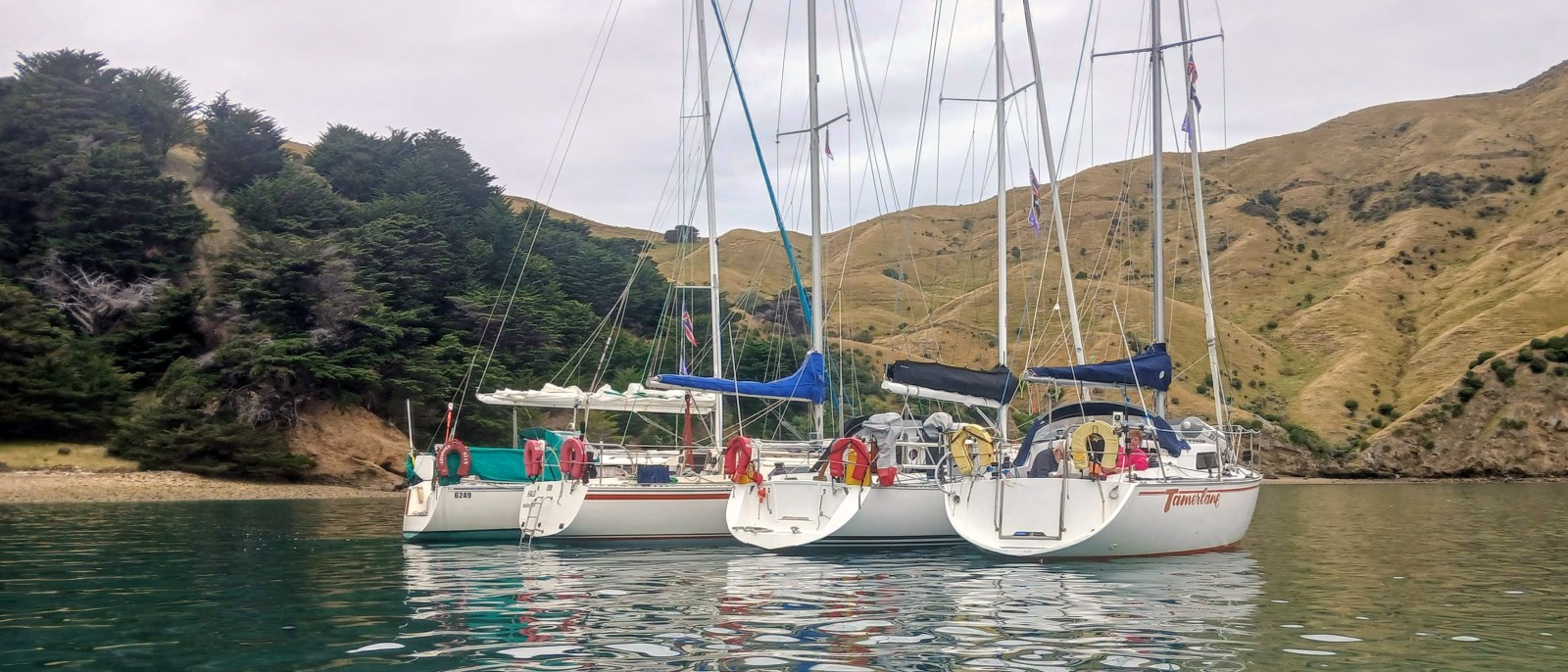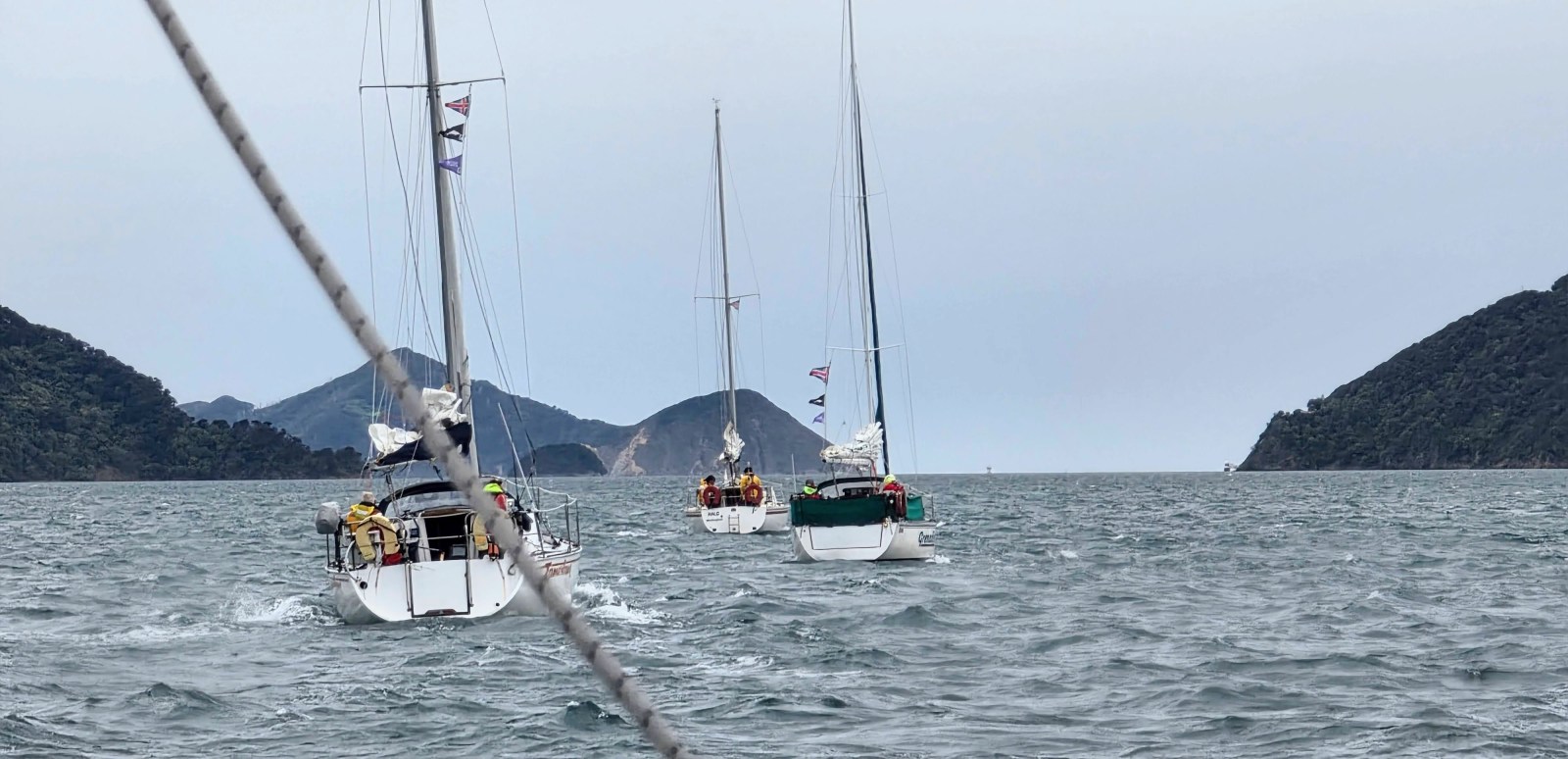 After consulting with the other skippers, we decided—rather than stopping at Catherine Cove—to press on around Clay Point, past the Chetwode Islands to Guards Bay to try our luck on the Punt Rails Club mooring. We motor-sailed into a wet and breezy headwind, carrying a reef in the main.