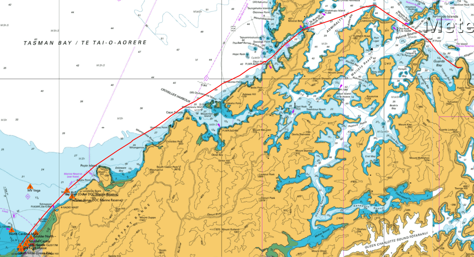 We then sailed across the top of Queen Charlotte Sound to transit the gap between The Brothers Islands and Cape Koamaru at 1300 hrs. We were heading southeast with the tide pushing us along, but with wind against tide the sea state was initially fairly choppy as we took care to remain well clear of Awash Rock.