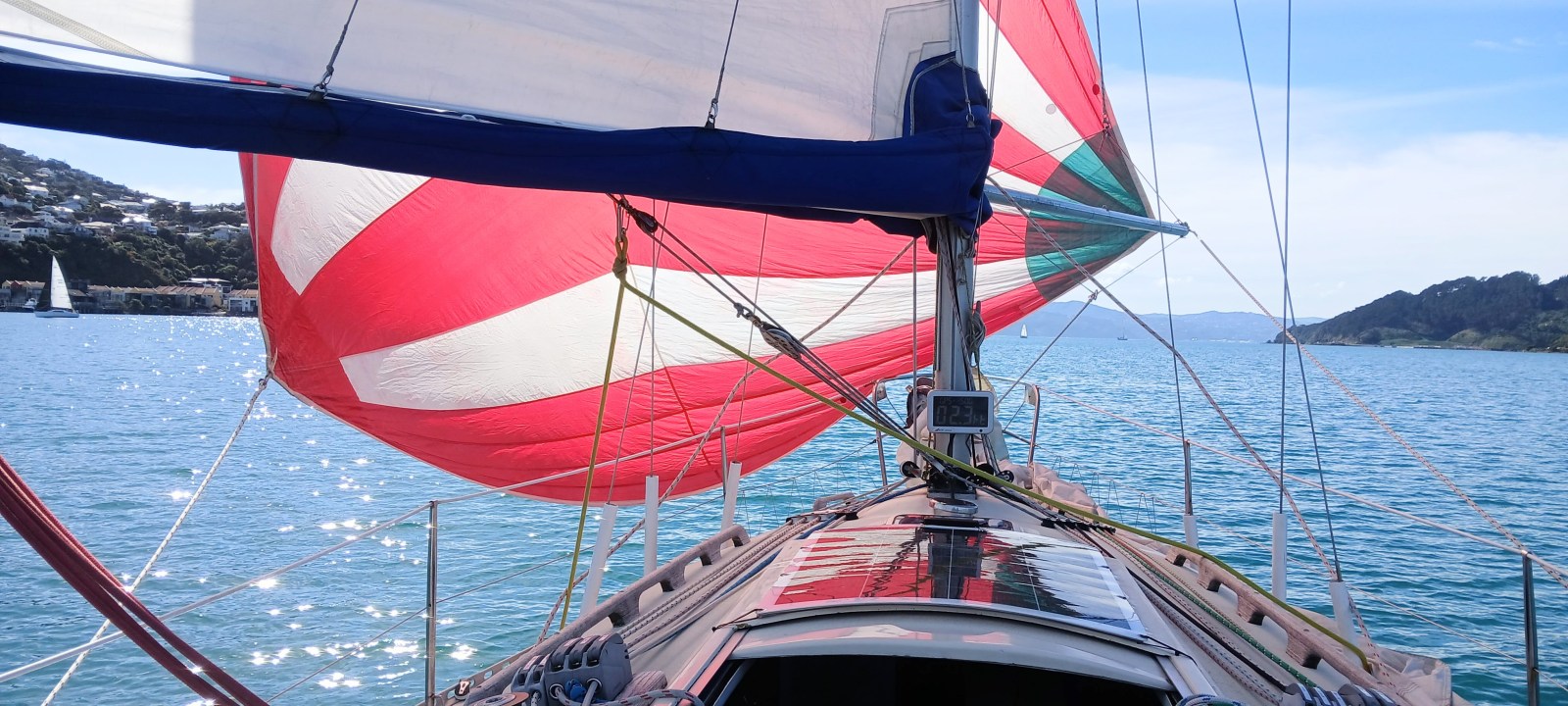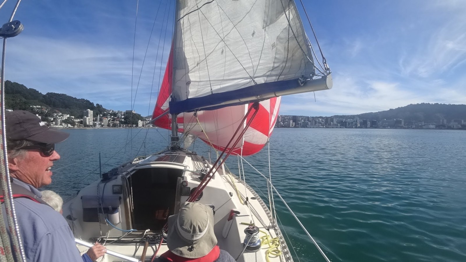 We set our spinnaker once more for the run into Oriental Bay, keeping the genoa drawing for a tight reach to what we believed was the correct 5-knot buoy.
